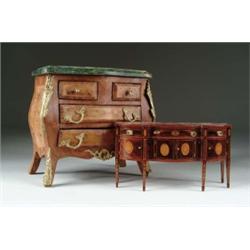 LOT OF TWO PIECES GOOD QUALITY REPRODUCTION MINIATURE FURNITURE. Consisting of 13” t. x 13 1/2” w. Bombe chest with bowed front, four drawers, with Ormolu mounting on sides and hardware on lower two drawers. One piece green marble top. Also, an inlaid sideboard with bowed front, six legs, three drawers, and four pull-out doors with compartment for dishes. Hand crafted and containing a Bill of Sale dated Sept. 1942. RS 1-4498-1188 (150-250)