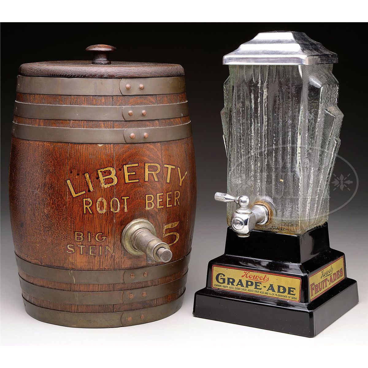 Brass bound, oak stave Liberty Root Beer barrel with original oak top, ceramic insert and nickel plated spigot. Original lettering decals read "Liberty Root Beer - Big Stein - 5". Howel's Grape-Ade dispenser has an art deco clear glass bowl mounted on a black glass base. Retains original spigot, metal lid and side panel graphics. Bottom embossed "Property of the Julep Co., Chicago." SIZE: Root Beer barrel: 9" dia x 13" t; Grape-Ade dispenser: 6" w x 13-1/2" t x 6" d. CONDITION: Both very good to excellent. Liberty barrel lacking metal feet. 1-13423