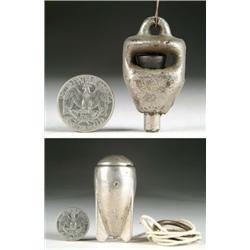 LOT OF TWO TOY CAP BOMBS. (1) "Bing Go" nickel-plated cap bomb. BOMB26. Maker unknown. Circa 1920. SIZE: 1-7/8" l. CONDITION: Very good. (2) Arial nickel-plated bomb by Hubley. BOMB22. Circa 1925. SIZE: 2-1/2" l. CONDITION: Very good. MC 1-4195 & 1-4234 (100-150)