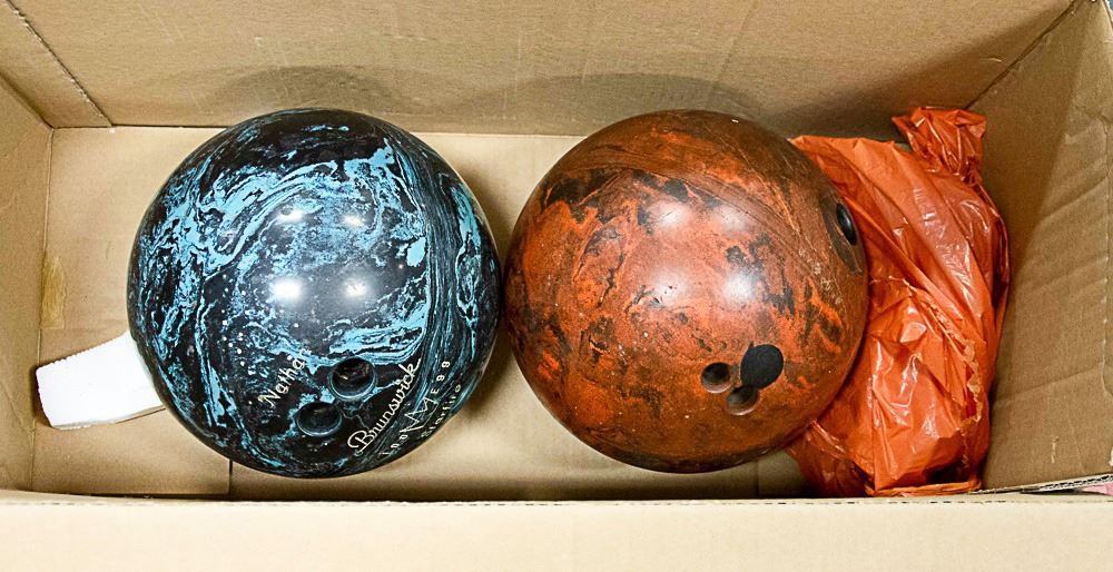 LOT OF TWO VINTAGE BOWLING BALLS ONE IS BRUNSWICK