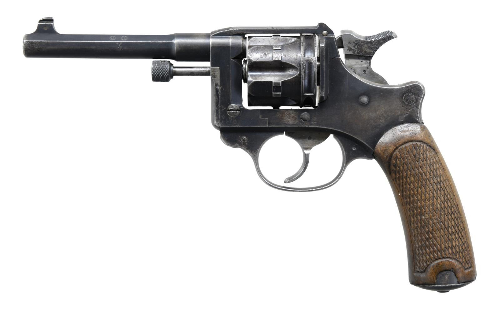 Both cal. 8mm French Ordnance. Both have 4 1/2" bbls. 1) S# H12178. Bbl. dated 1903. Fixed rear sight. Bead front sight. Blued finish w/ straw trigger, hammer & loading gate. Checkered walnut grips. Lanyard ring & lanyard not present. CONDITION: grips show scattered handling wear & some dings. Strawed parts are mostly silver w/ pitting & oxidation. Balance of metal shows a fading original blue w/ scattered pitting & oxidation. Bore shows scattered pitting but strong rifling. (23-2468/MJC). CURIO. 2) S# F92434. Bbl. dated 1896. Fixed rear sight. Bead front sight. Blued finish w/ straw trigger, hammer & loading gate. Checkered walnut grips. Lanyard ring present on bottom of grip frame. CONDITION: grips show worn checkering w/ scattered dings & handling marks. Straw parts are mostly gray w/ oxidation & traces of original finish. Balance of metal retains 30% original blue w/ scattered oxidation & light pitting. Fair bore w/ scattered pitting but strong rifling. (01-23962/MJC) ANTIQUE. $600-1,000.