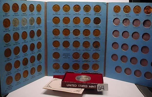LOT OF US COINS INCL. LINCOLN CENT COLLECTION - Lincoln Cent Collection 1941 - 1964-D Complete and 1982-S Proof Silver George Washington Commemorative Half Dollar w/ COA