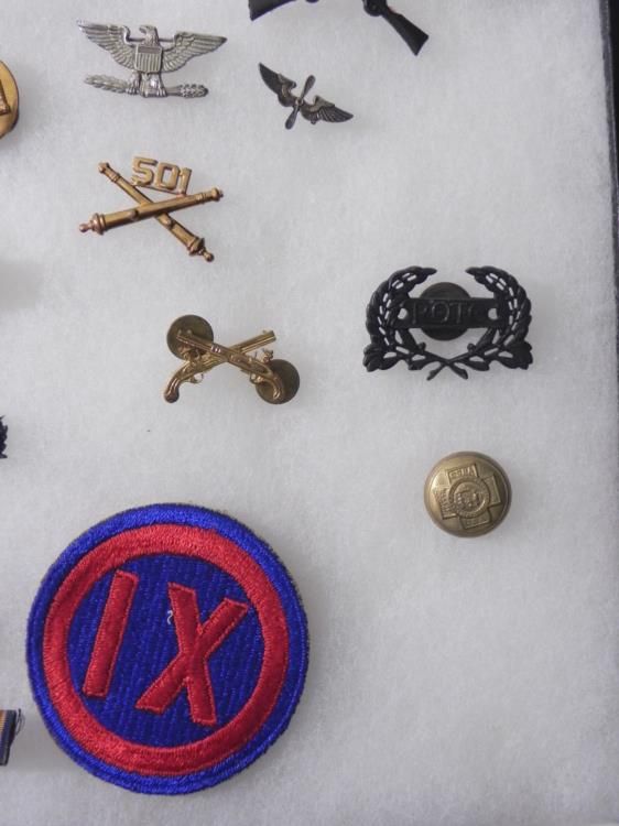 LOT OF US MILITARY INSIGNIA, PATCHES ETC-IN RIKER MOUNT