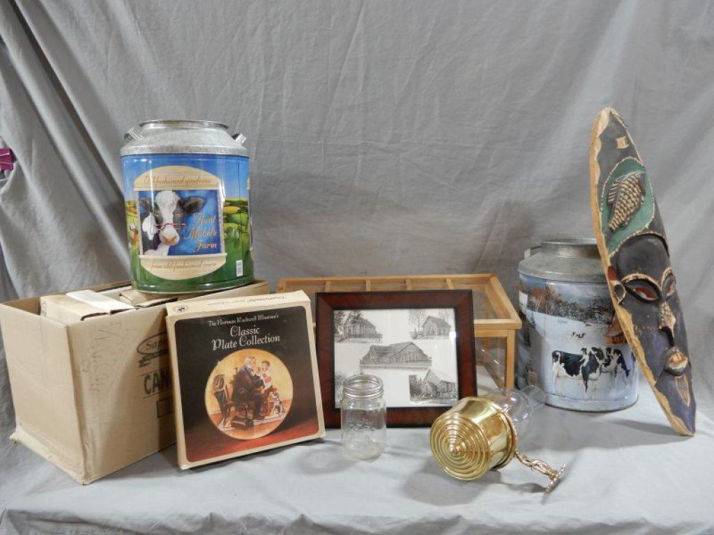 LOT OF VARIOUS COLLECTIBLES CANS - JAR - BOX OF COLLECTOR PLATE - PICTURE - FRAMED PICTURE - GREEN HOUSE LOCATION: LOWER BACKROOM