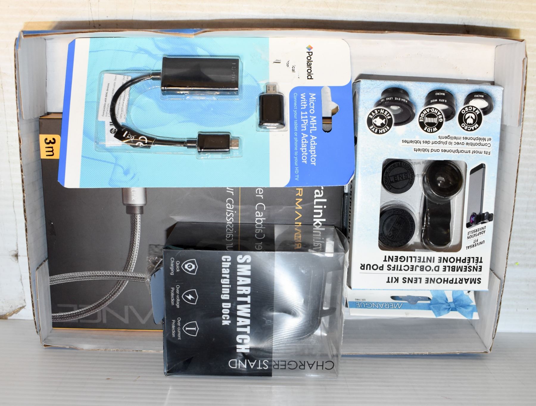 SMARTPHONE LENS KIT, POLAROID MICRO MHL ADAPTER, 8 PIN CONNECTOR, ULTRA LINK PERFORMANCE SUBWOOFER CABLE RCA TO RCA, SMARTWATCH CHARGING DOCK