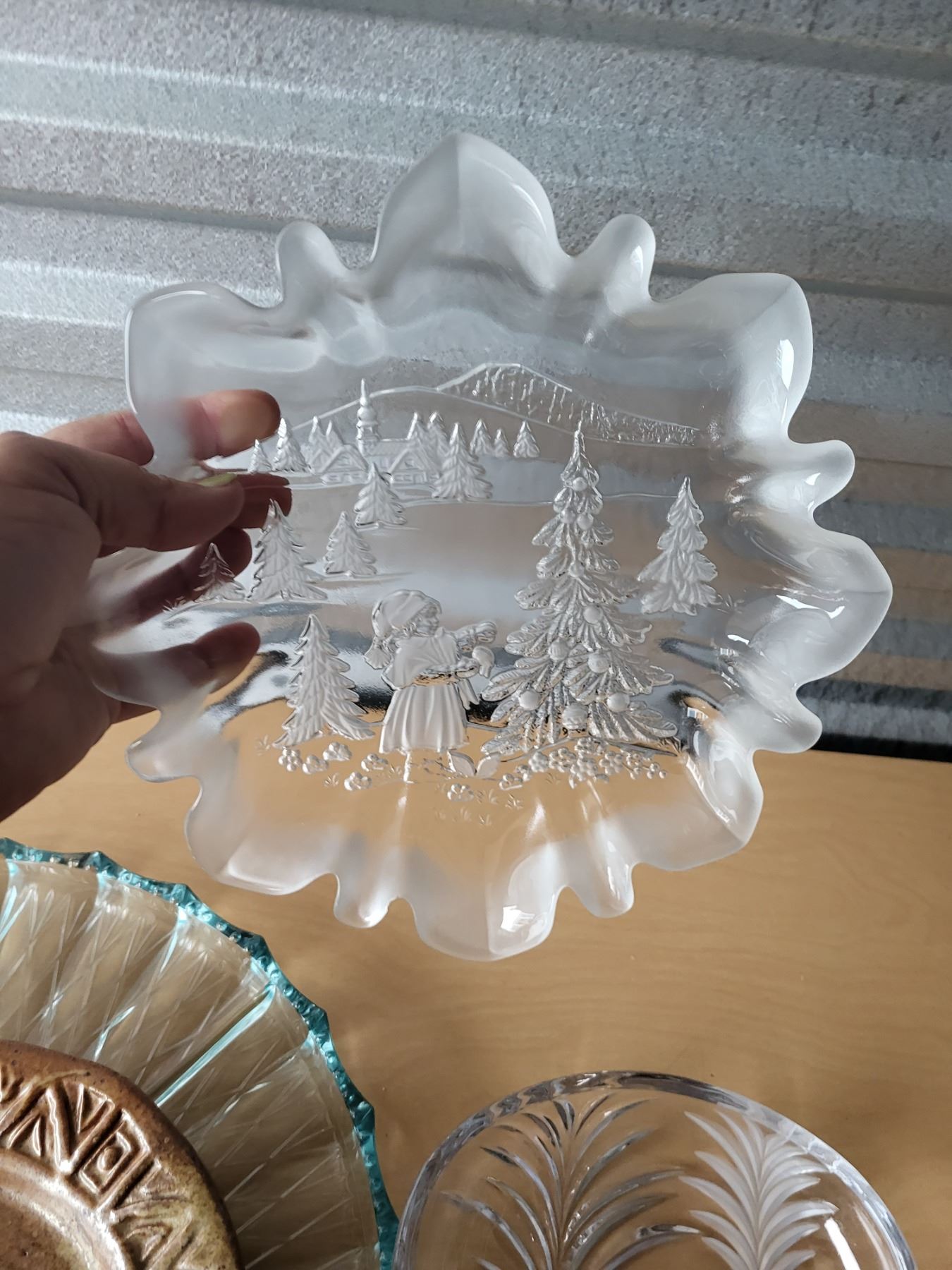 LOT OF VARIOUS GLASS/CRYSTAL SERVING DISHES. SOME ARE MODERN, SOME ARE VINTAGE. THE ONE IS HANDCRAFTED POTTERY