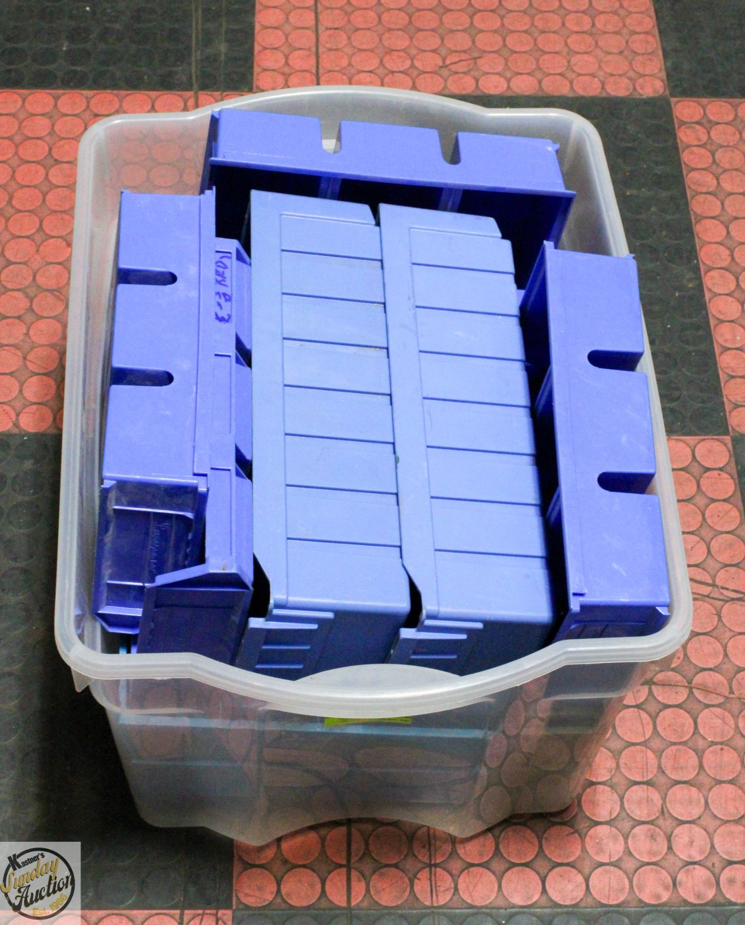 LOT OF VARIOUS LARGE BLUE BINS FOR GARAGE
