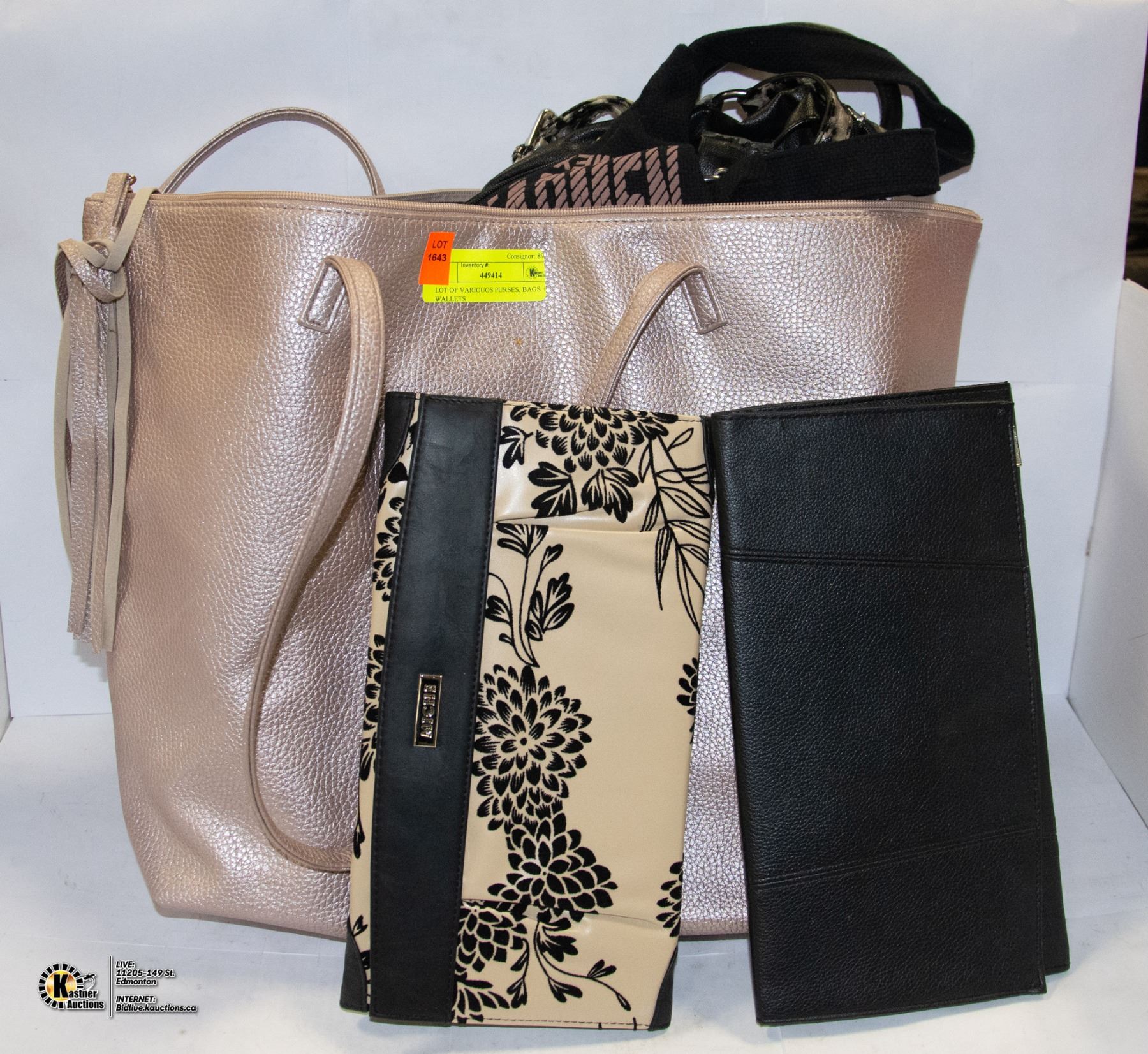 LOT OF VARIOUS PURSES, BAGS + WALLETS