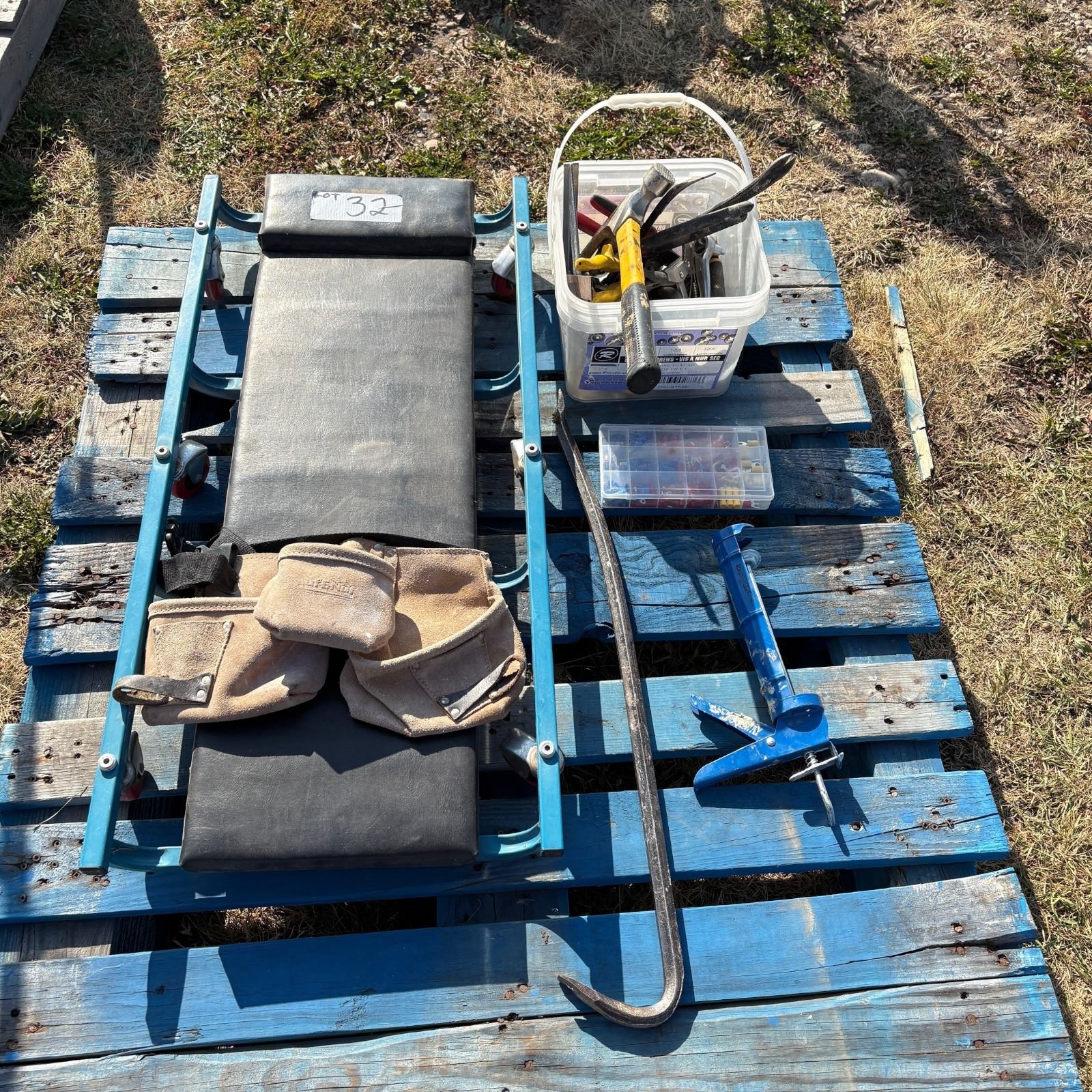 mechanic creeper, pail of tools, pry bar, caulking gun, wire connector kit, tool belt