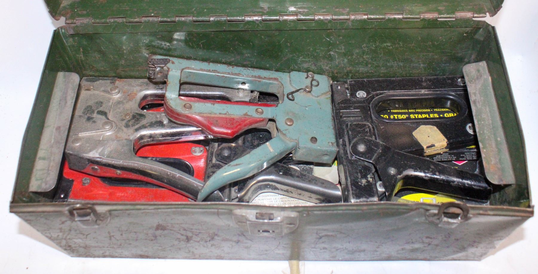 LOT OF VARIOUS STAPLE GUNS IN METAL CASE