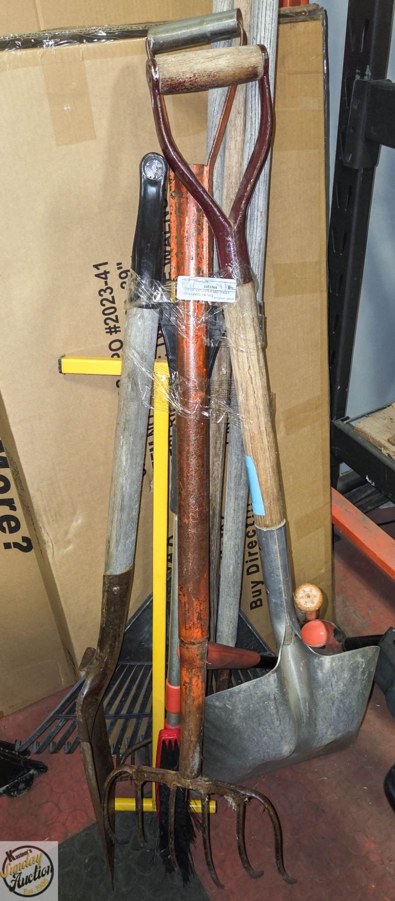 LOT OF VARIOUS YARD TOOLS INCLUDING SHOVEL