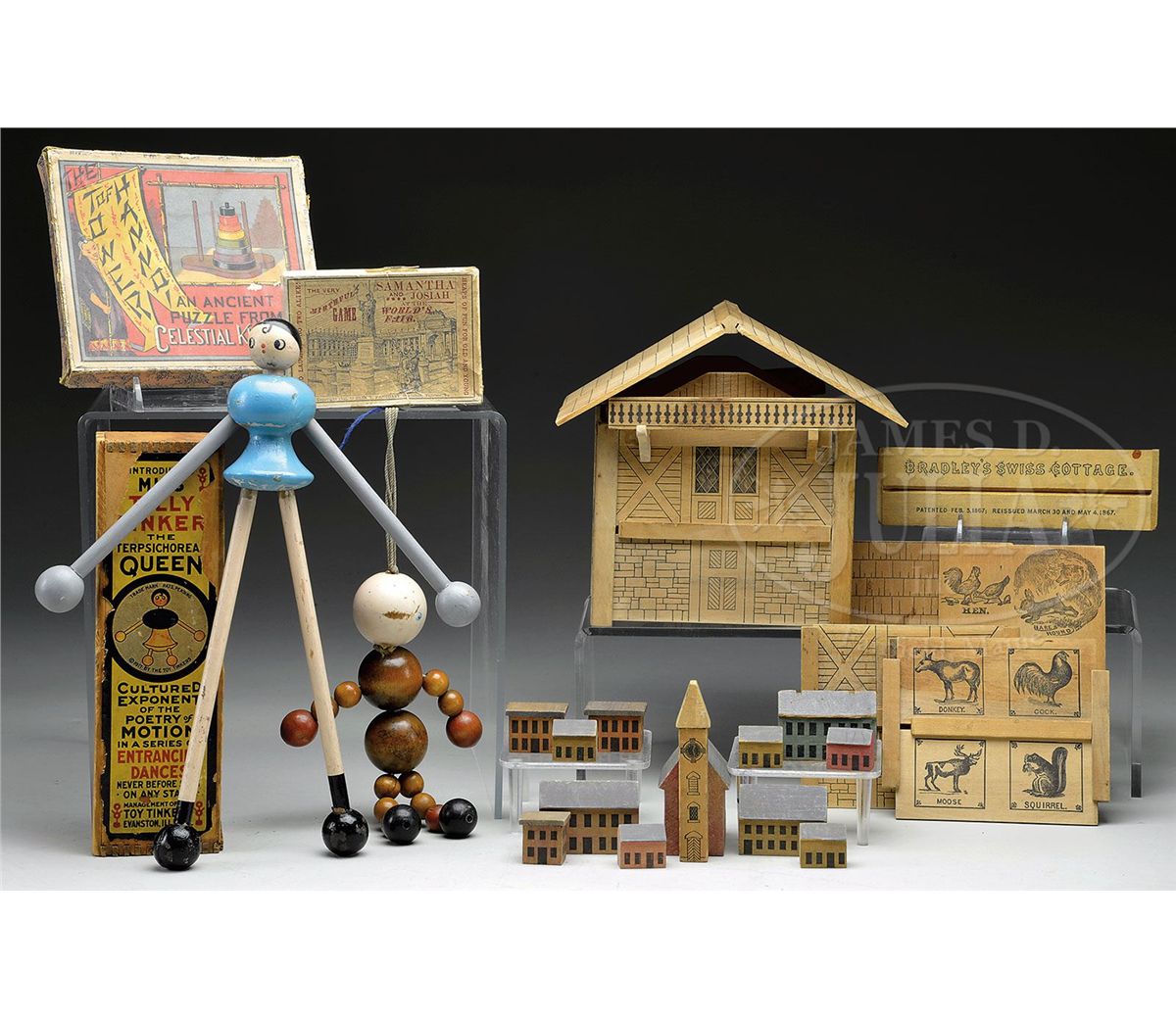 Lot includes 1) The Tower of Hanoi puzzle by Milton Bradley with original box (one flap detached but present). 2) Miss Tilly Tinker wooden dancing toy with here original box bottom retaining much of its paper labels. Copyright 1917. 3) Samantha and Josiah parlor game with original box and instructions, copyright 1893 by Olin Pancoast. Box taped and torn. 4) Milton Bradley painted miniature village buildings. 5) Stenciled wood barnyard menagerie. SIZE: Varies. PROVENANCE: The Diane and late Steve Olin collection. CONDITION: Good to very good unless otherwise noted. 1-13271-50