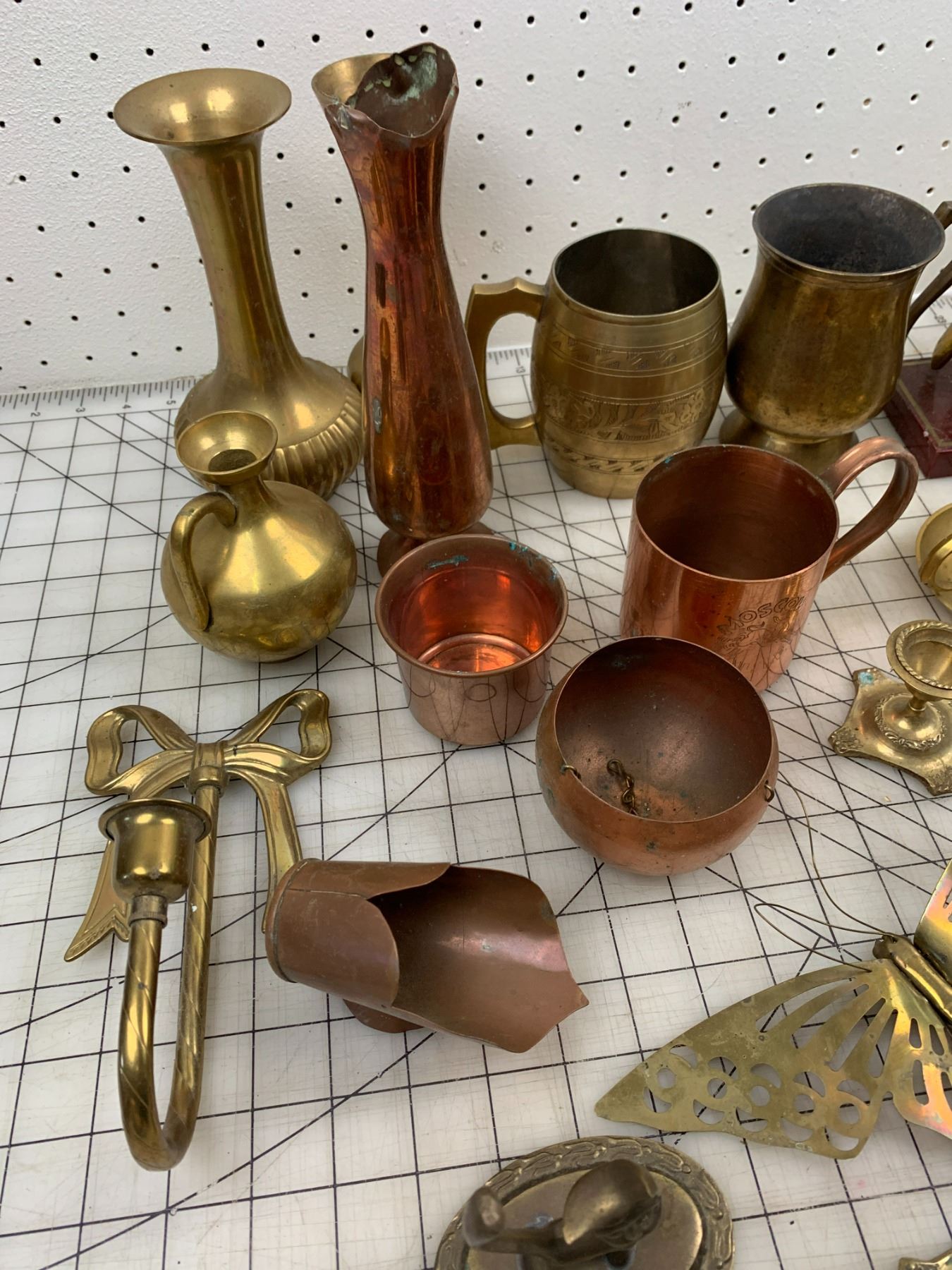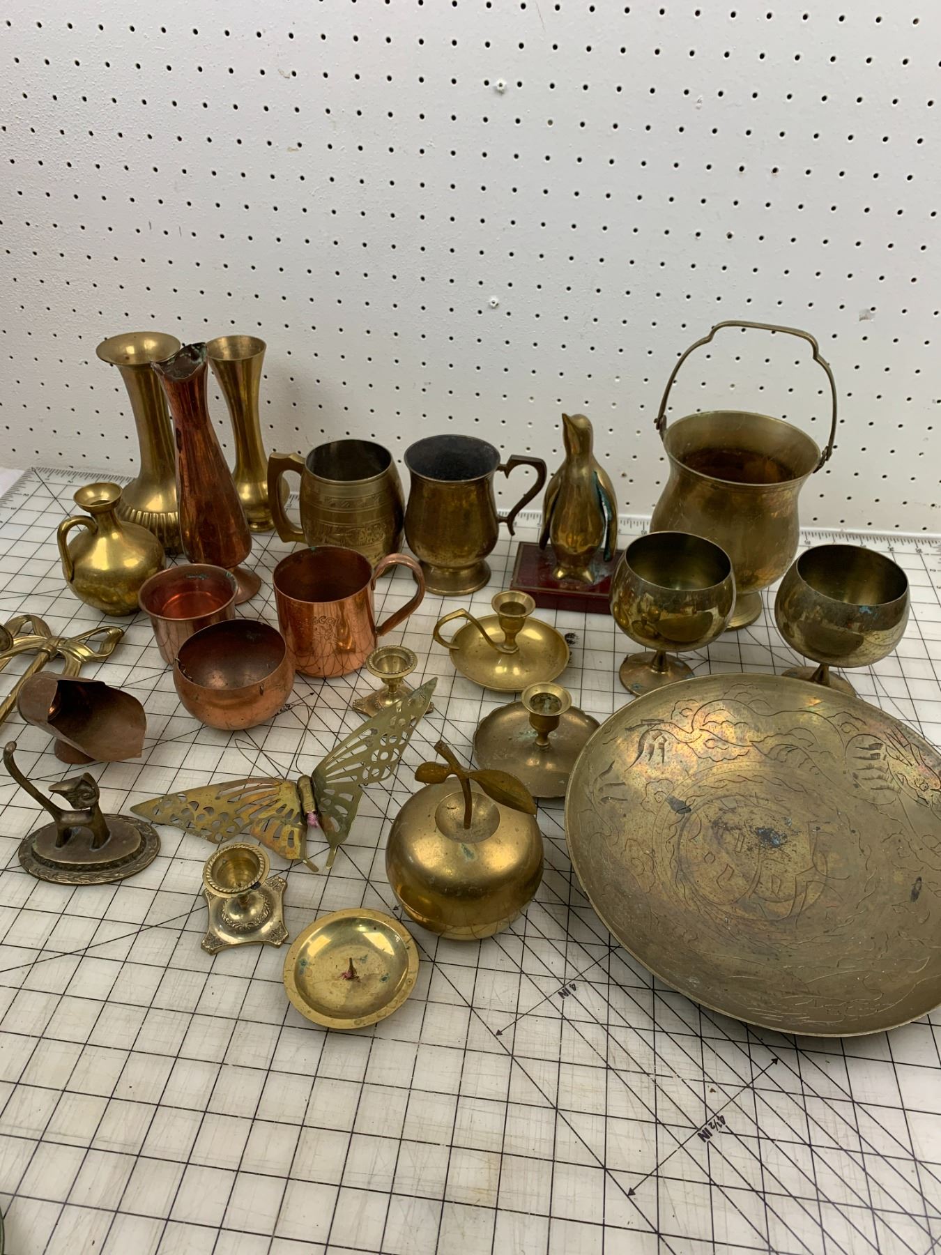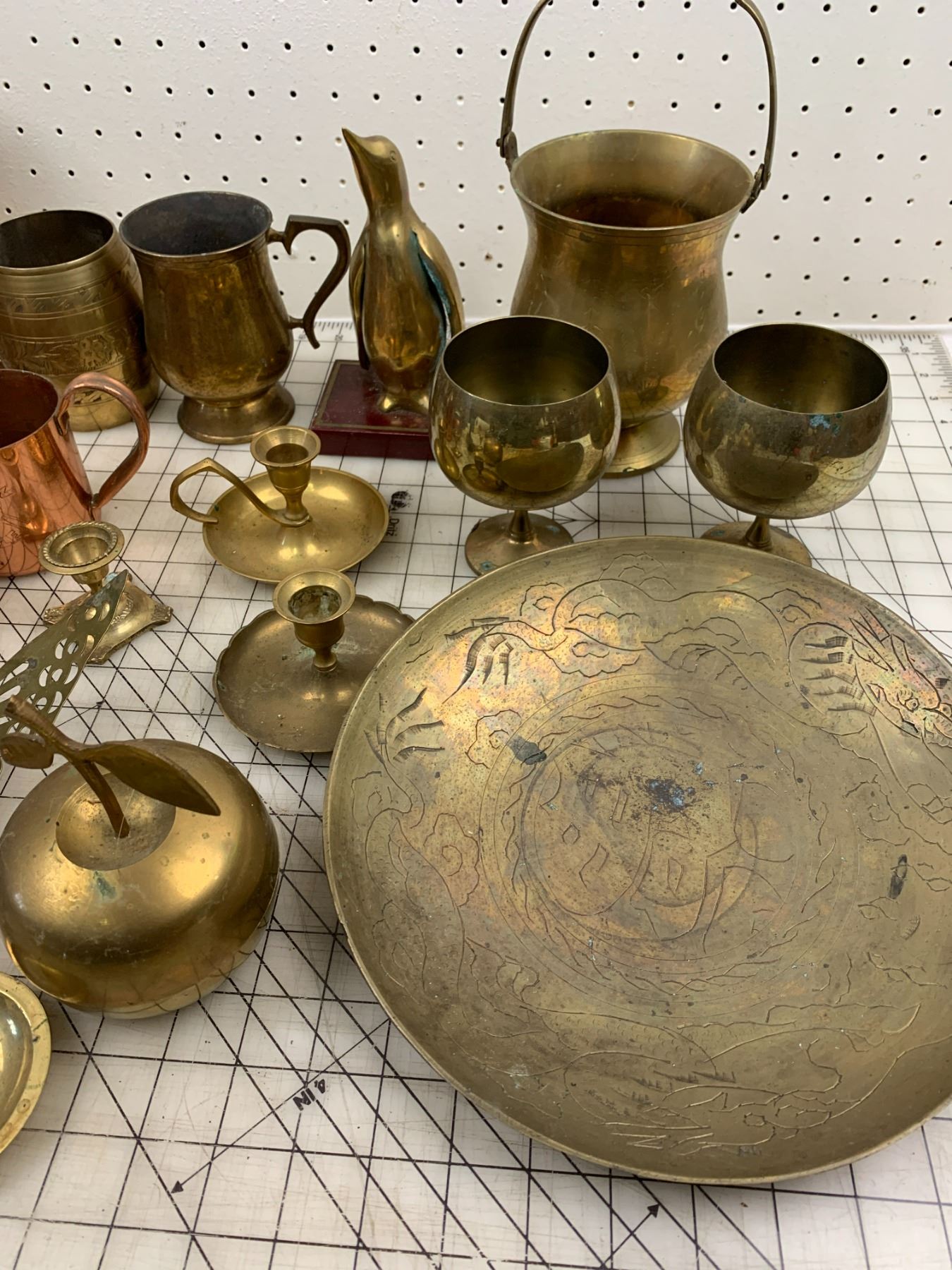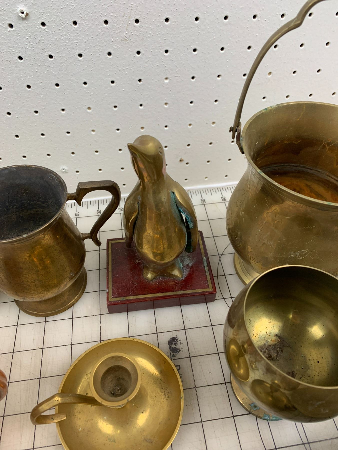 LOT OF VINTAGE BRASS AND COPPER MUGS CANDLE HOLDERS PENGUIN ETC