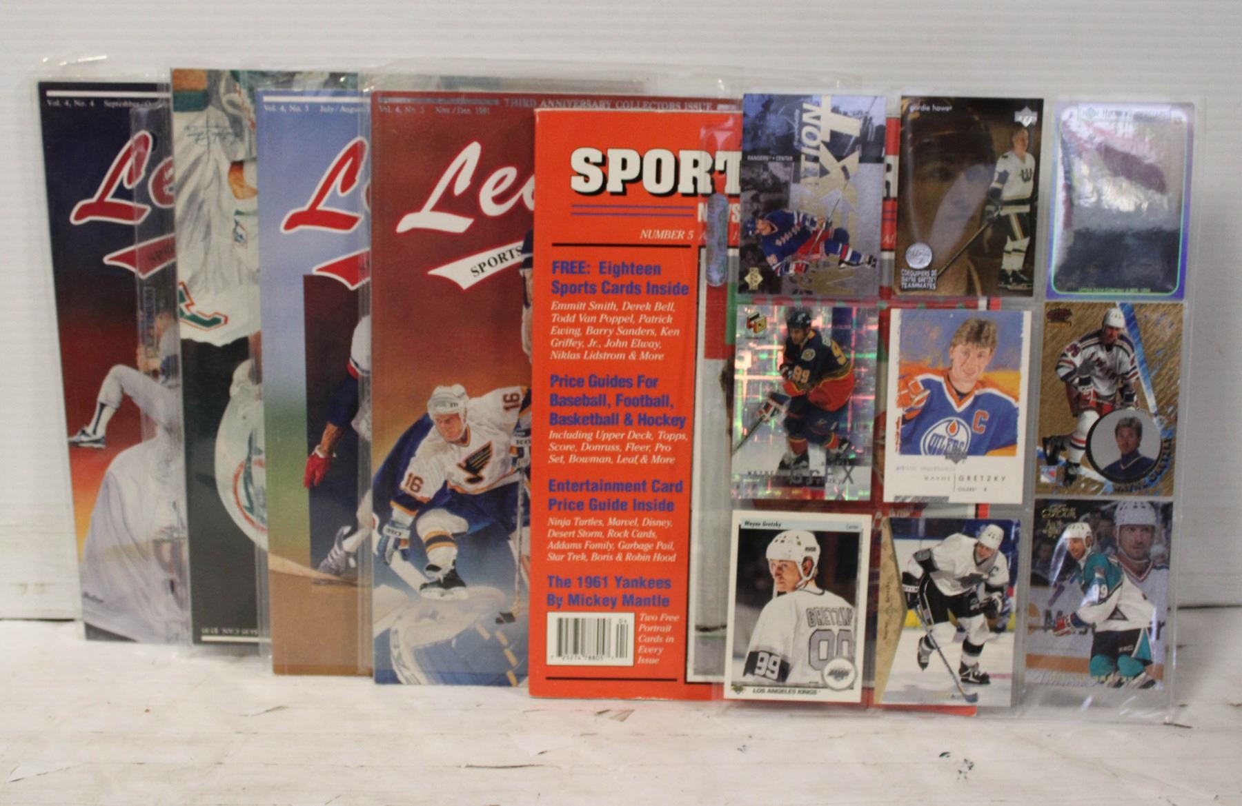 HOCKEY CARDS AND 4 VINTAGE LEGENDS MAGAZINE WITH NEW CARDS AND ONE SPORTS CARDS INCL NEW CARDS