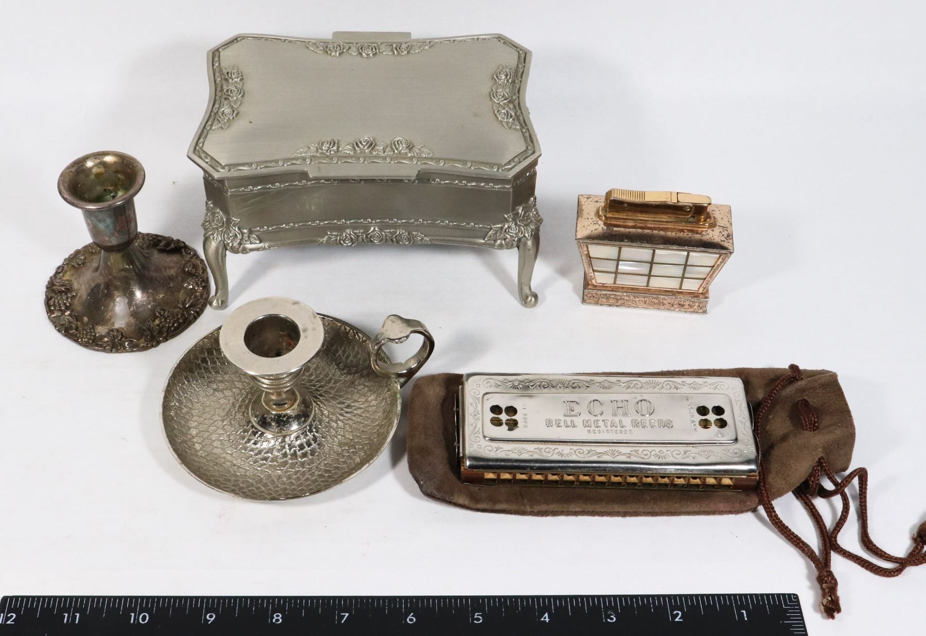 CANDLE HOLDERS, UNIQUE LIGHTER, AND TRINKET BOX. HARMONICA IS ECHO BELL METAL REEDS MADE IN GERMANY (DENT TO TOP). LIGHTER IS MADE IN JAPAN