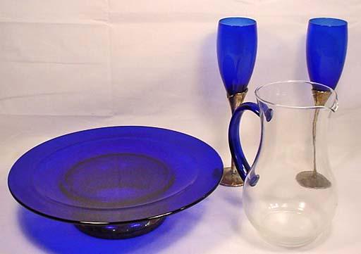 LOT OF VINTAGE GLASSWARE - Cobalt blue tray, goblets and clear glass pitcher w/ cobalt blue handle