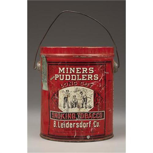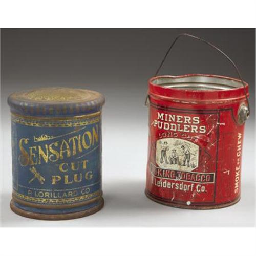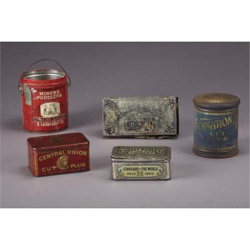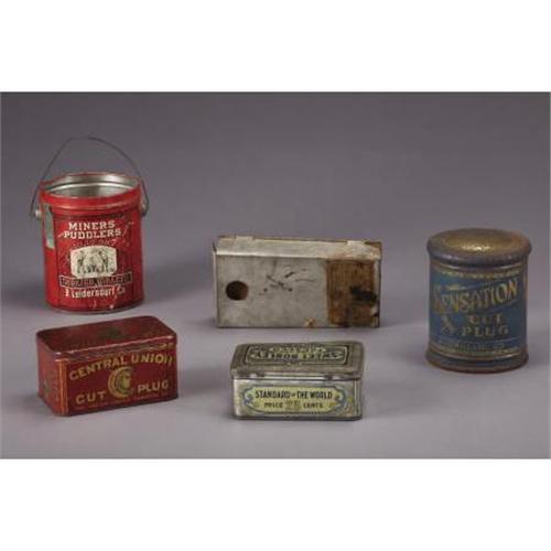 <B>LOT OF VINTAGE LITHOGRAPHED TOBACCO TINS</B></I> - <BR>a) “Miners and Puddlers Long Cut”; red; dented; no lid; original bale; 6½' tall; nice central graphic of miners.<BR>b) “Sensation Cut Plug”; gold on blue with original lid; 6: tall; rusted; no dents.<BR>c) “Sweet Burley”; 4” x 6”; blue on silver.<BR>d) “Central Union Cut Plug”; 4”x 6” overall very good; some scratches.<BR>e) “Metropolitan” blue on silver; with inside paper label; seems loose, bent; 4½” x 8½”.<BR><BR><b>Shipping:</b> Miscellaneous Collectibles, Larg (<a target="_blank" href="http://www.heritageauctions.com/common/shipping.php">view shipping information</a>)
