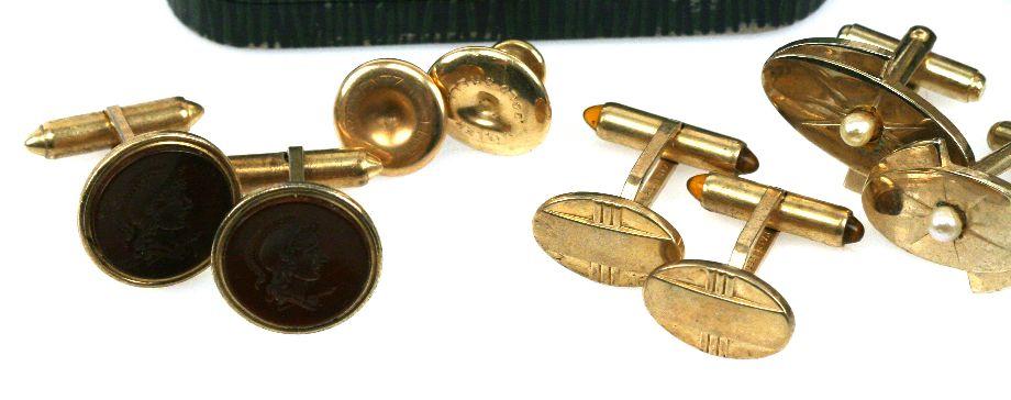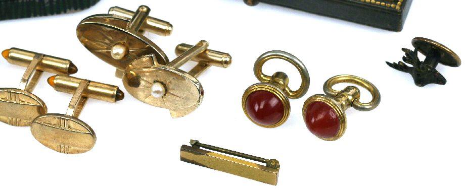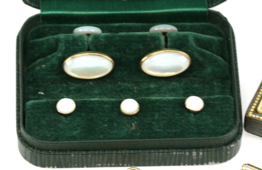A good lot of men's vintage and antique cuff links, pins and tuxedo buttons with mother of pearl, intaglio, and carnelian sets. Condition: Very good