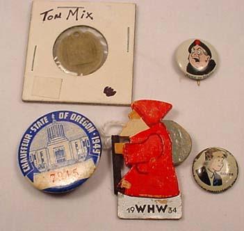 LOT OF VINTAGE MISCELLANEOUS TREASURES - Incl. Tom Mix pendant, Skeezix pinback buttons, more