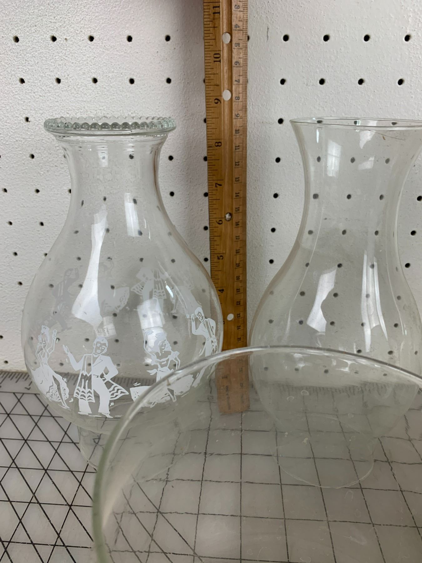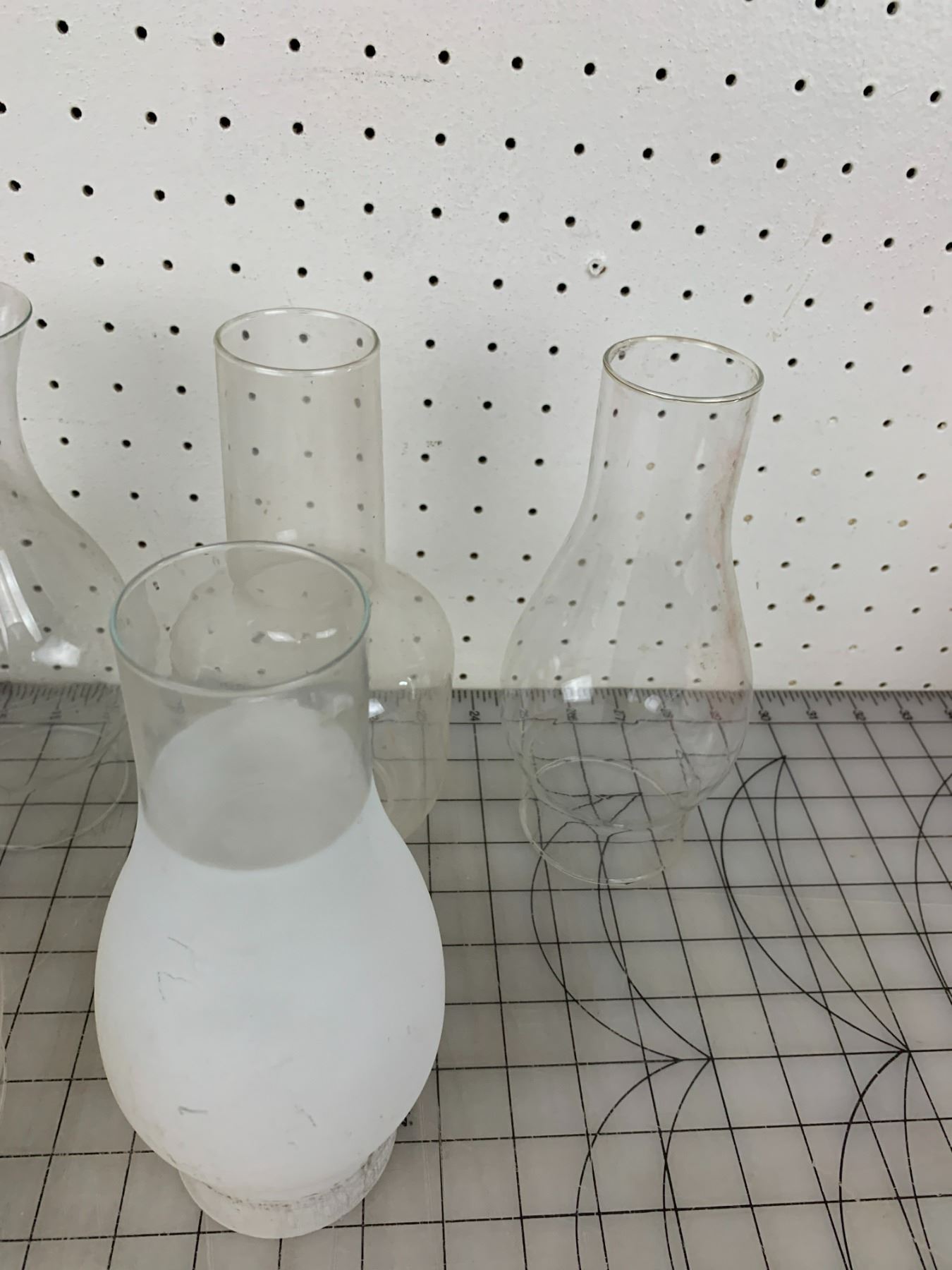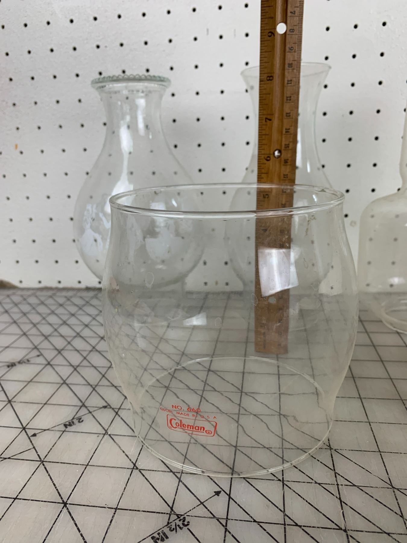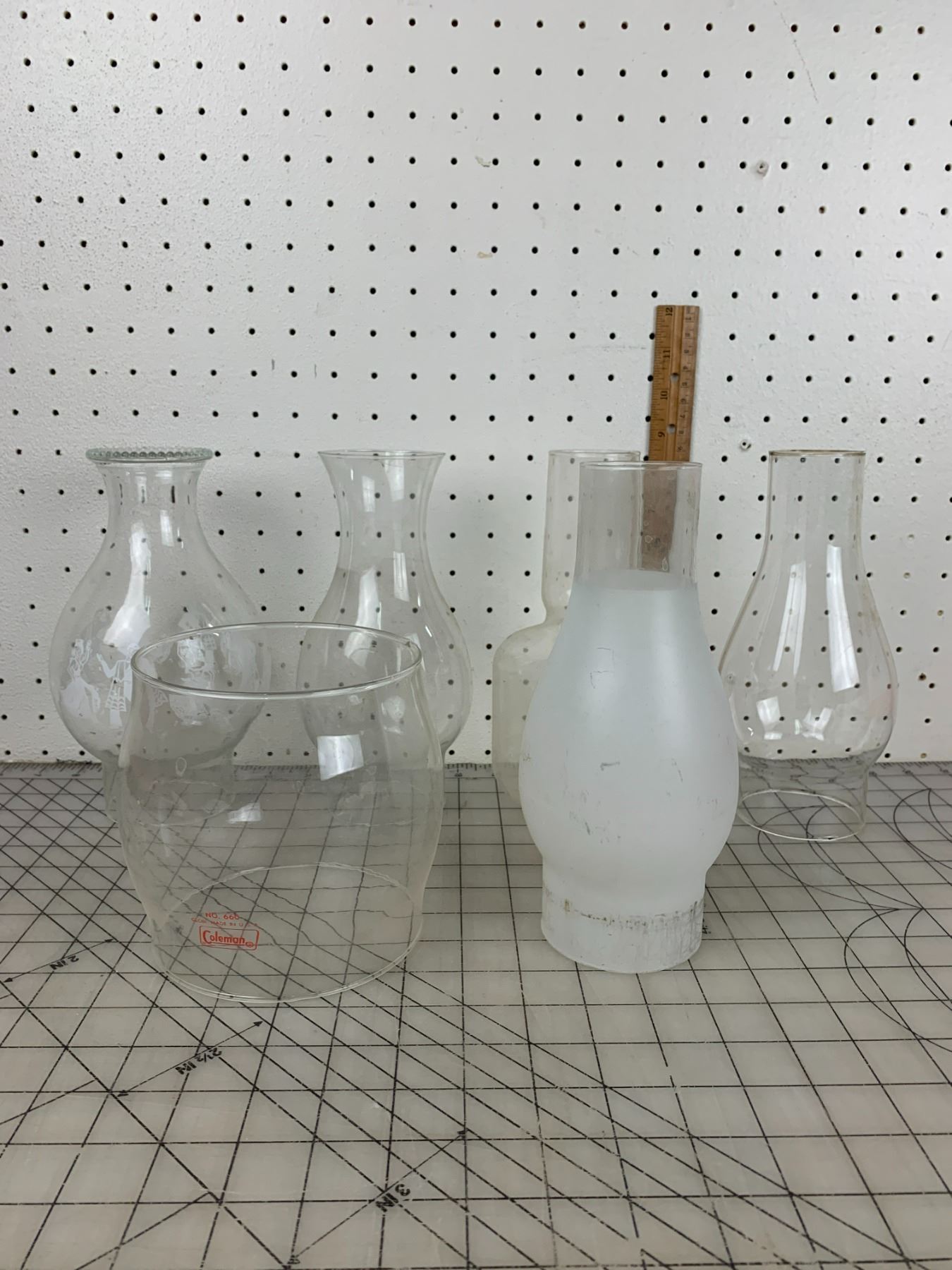 LOT OF VINTAGE OIL LAMP CHIMNEYS AND COLEMAN LANTERN GLOBE