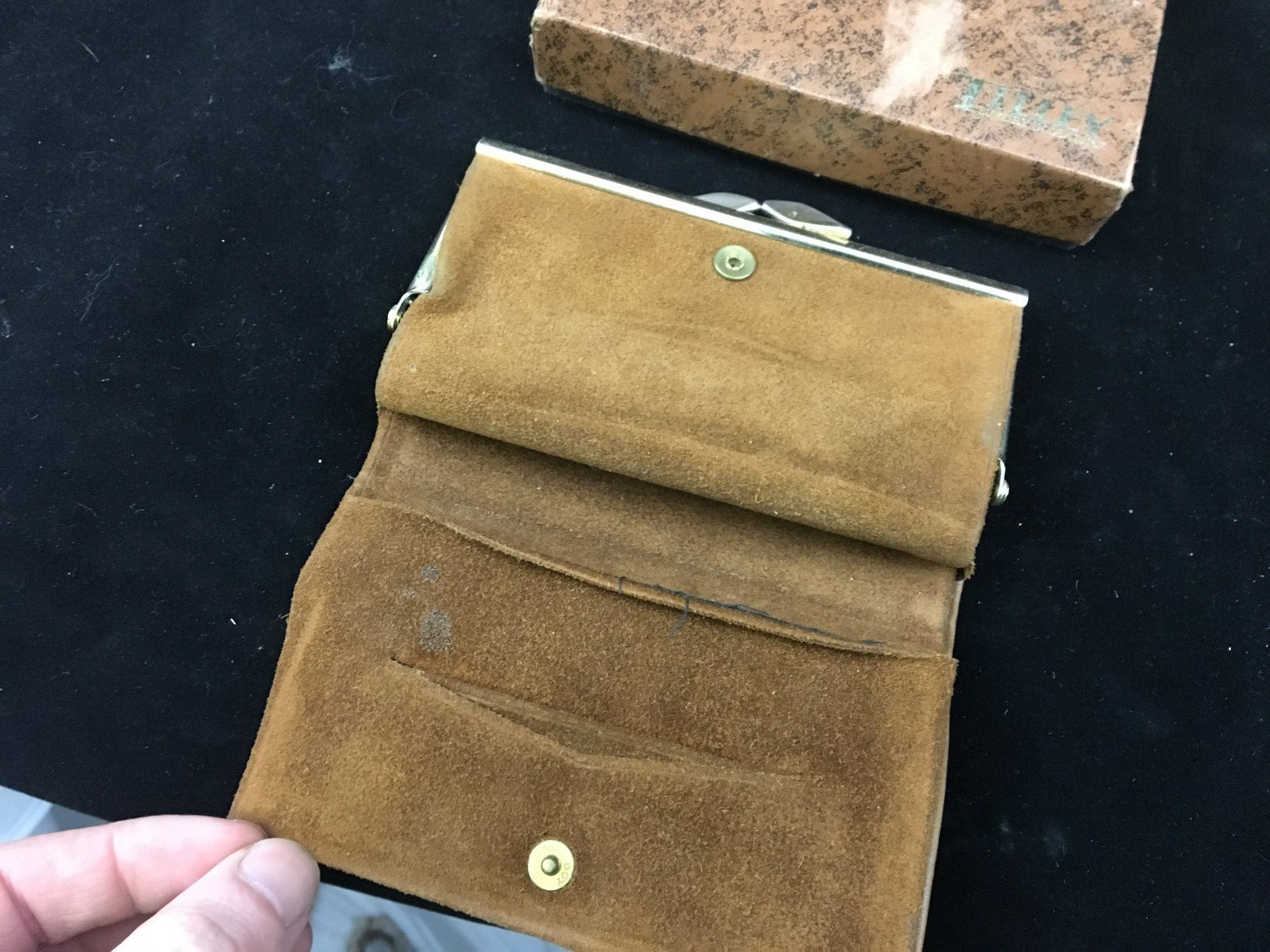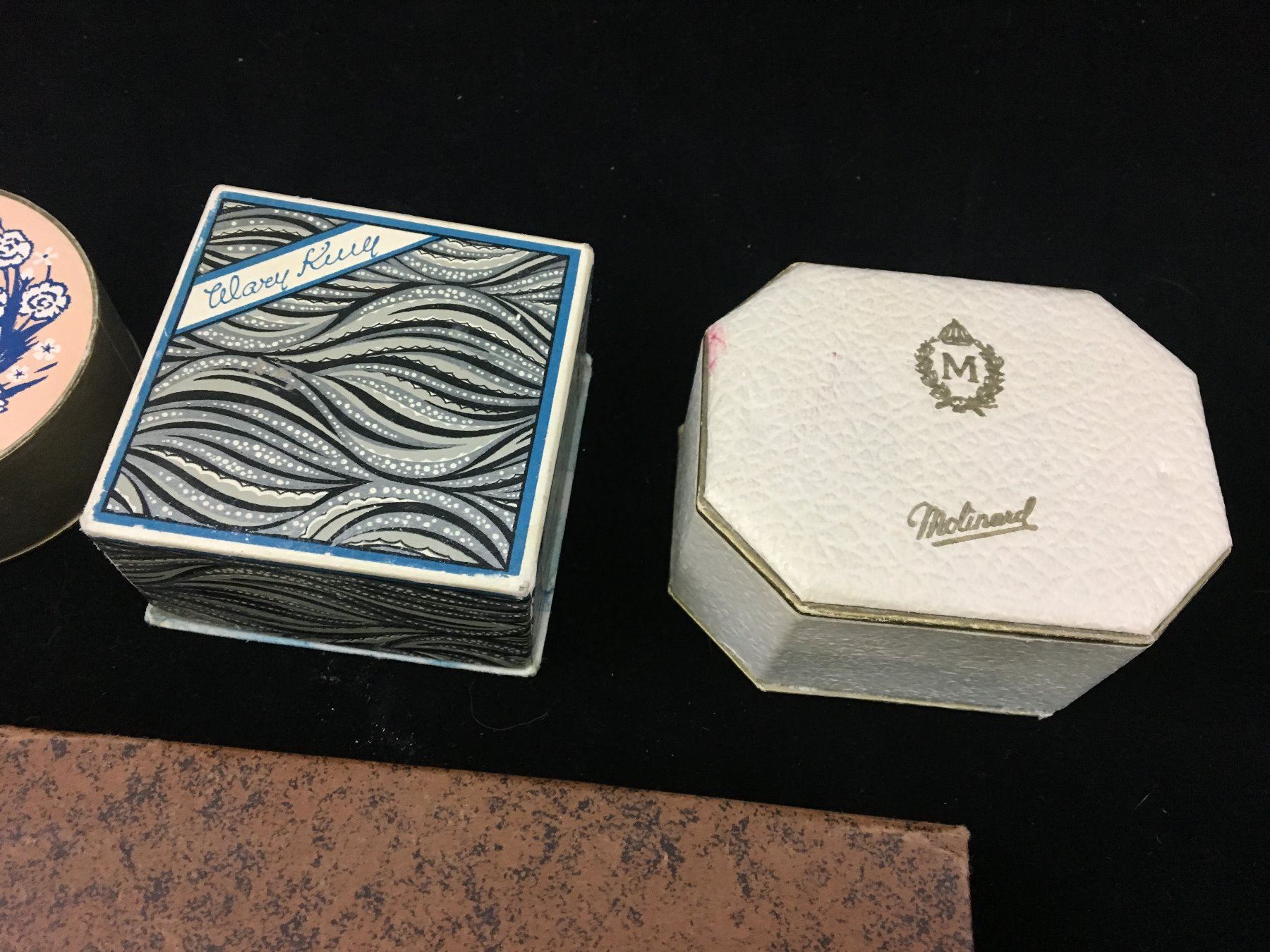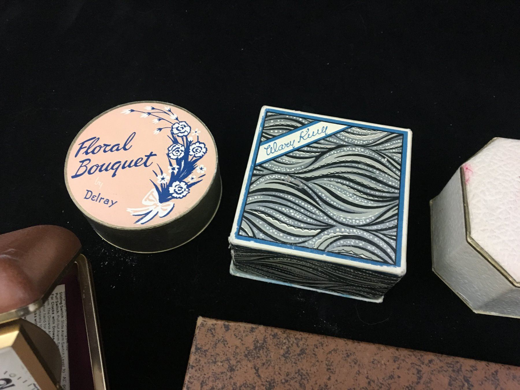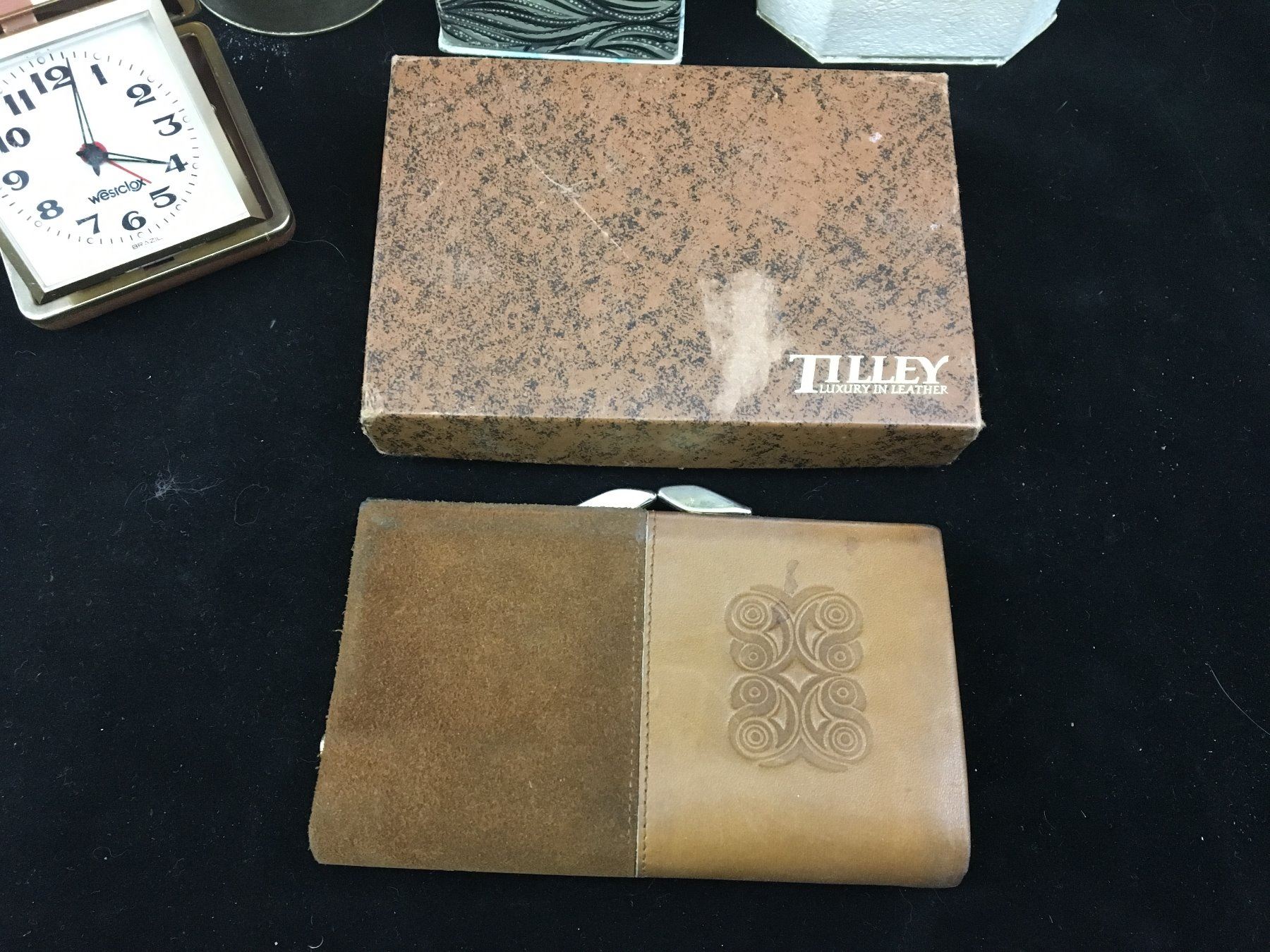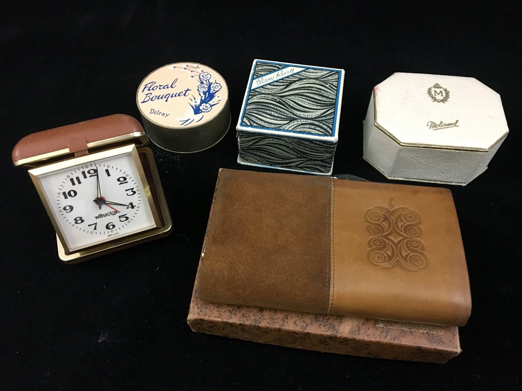 LOT OF VINTAGE POWDER BOXES, TILLEY LEATHER CLUTCH PURSE AND ALARM CLOCK