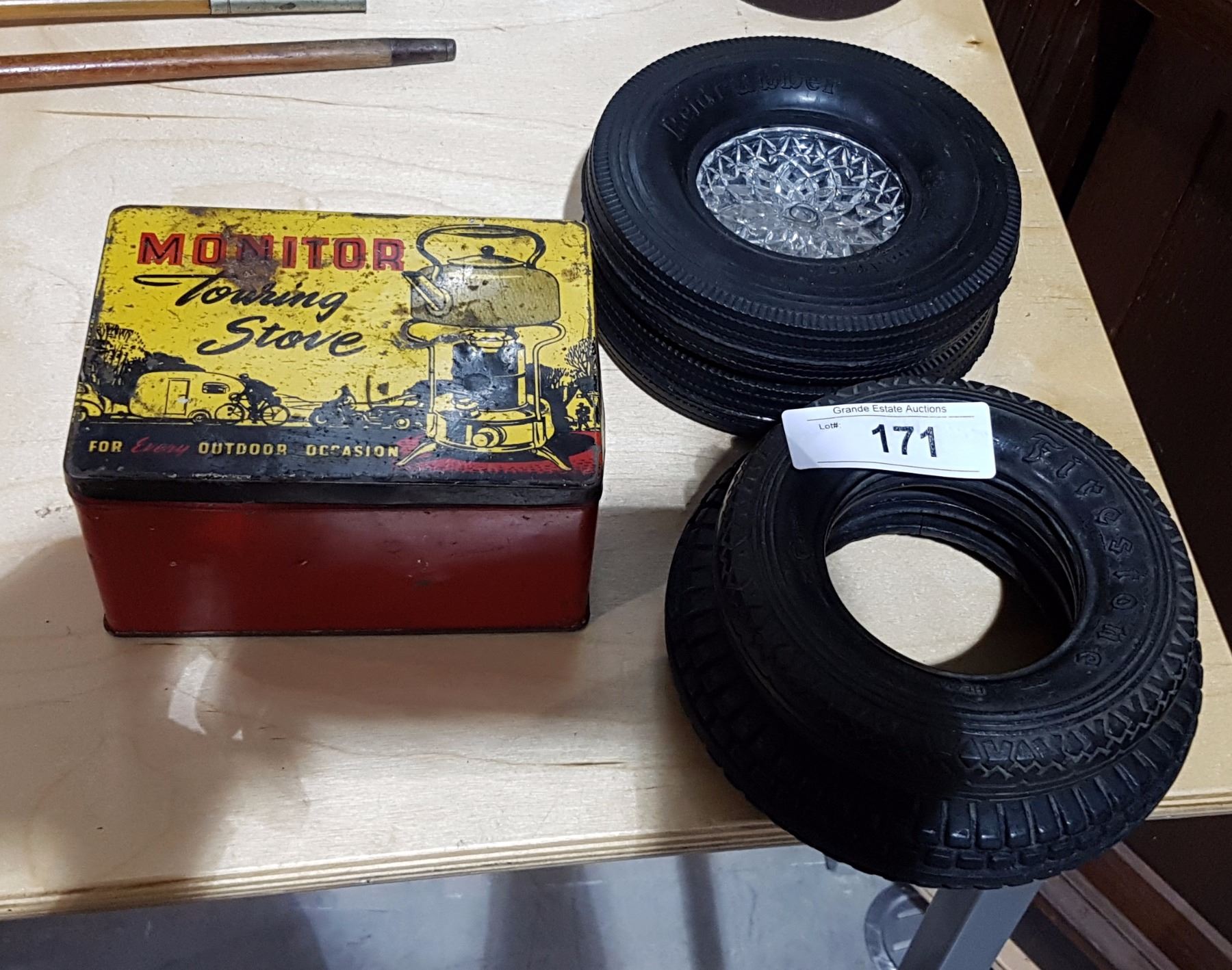 LOT OF VINTAGE RUBBER TIRE ASHTRAYS & MONITOR TOURING STOVE