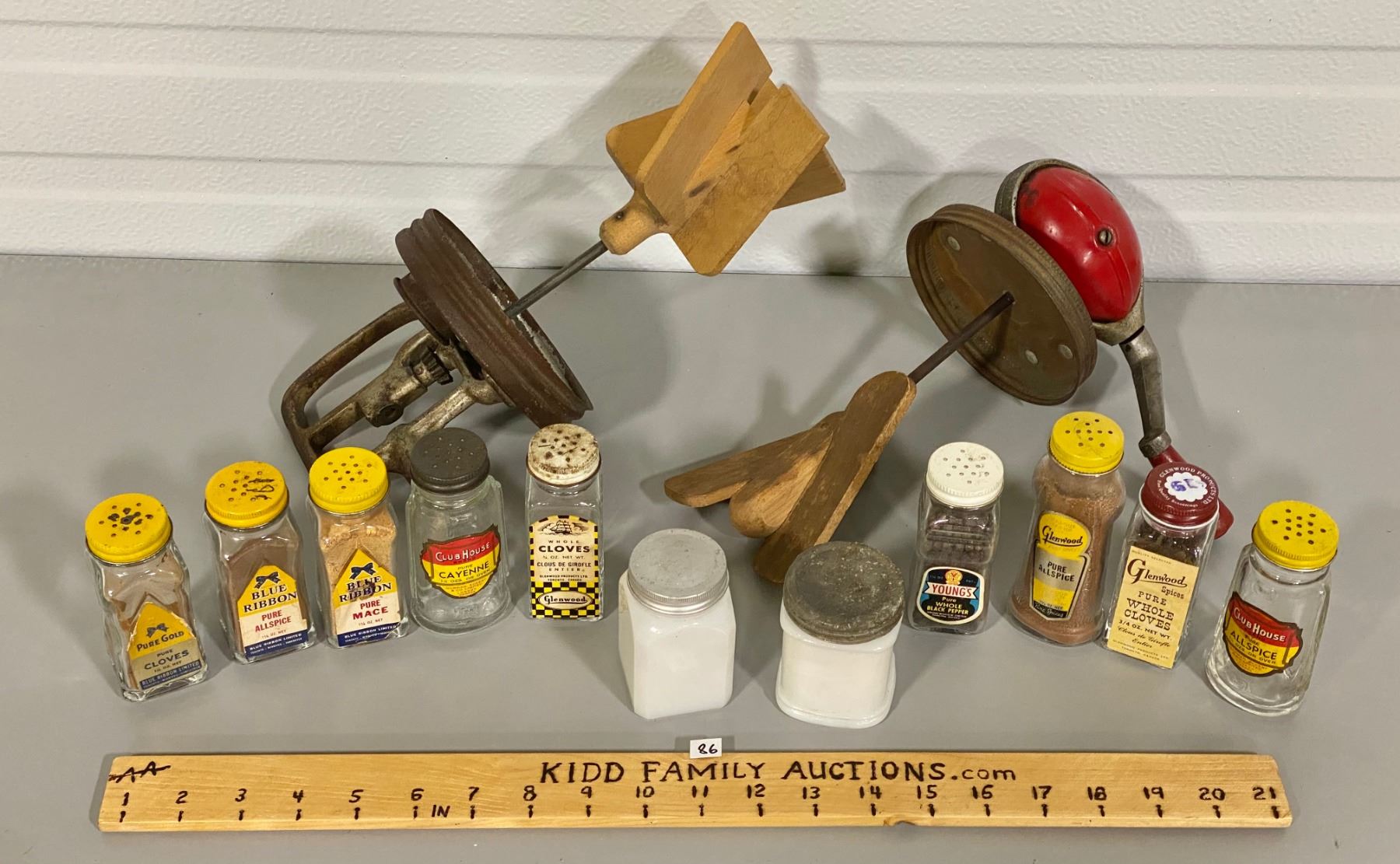 LOT OF VINTAGE SEASONING JARS & CHURN TOPS W/ PADDLES
