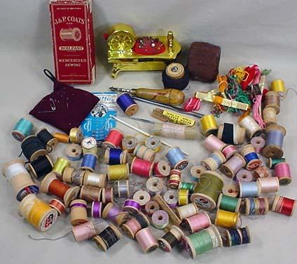 LOT OF VINTAGE SEWING ITEMS - INCL. ADVERTISING - Incl. Wooden spools - J.P. Coats, Coats, more. Also incl. J.P. Coats advertising box.