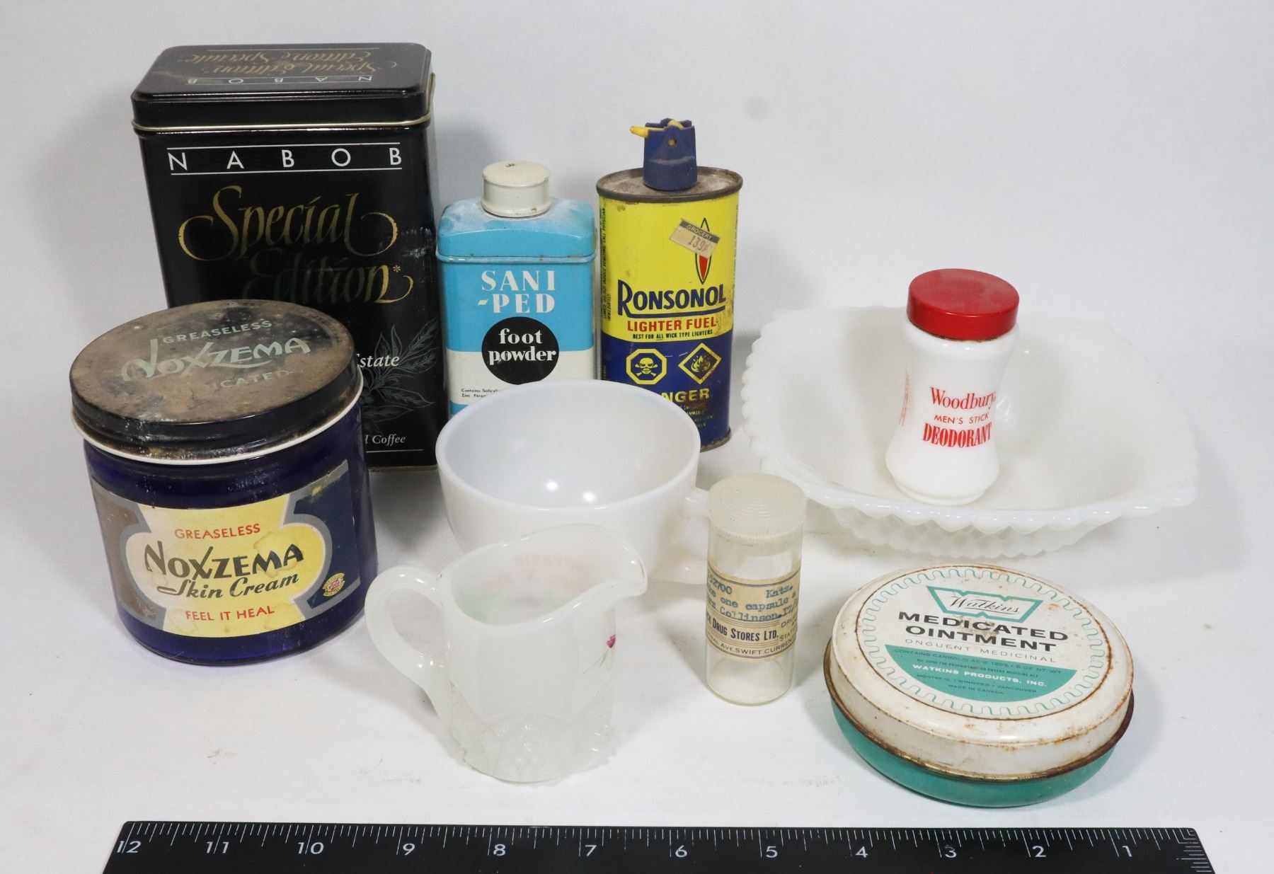 LOT OF VINTAGE TINS AND PIECES OF MILK GLASS