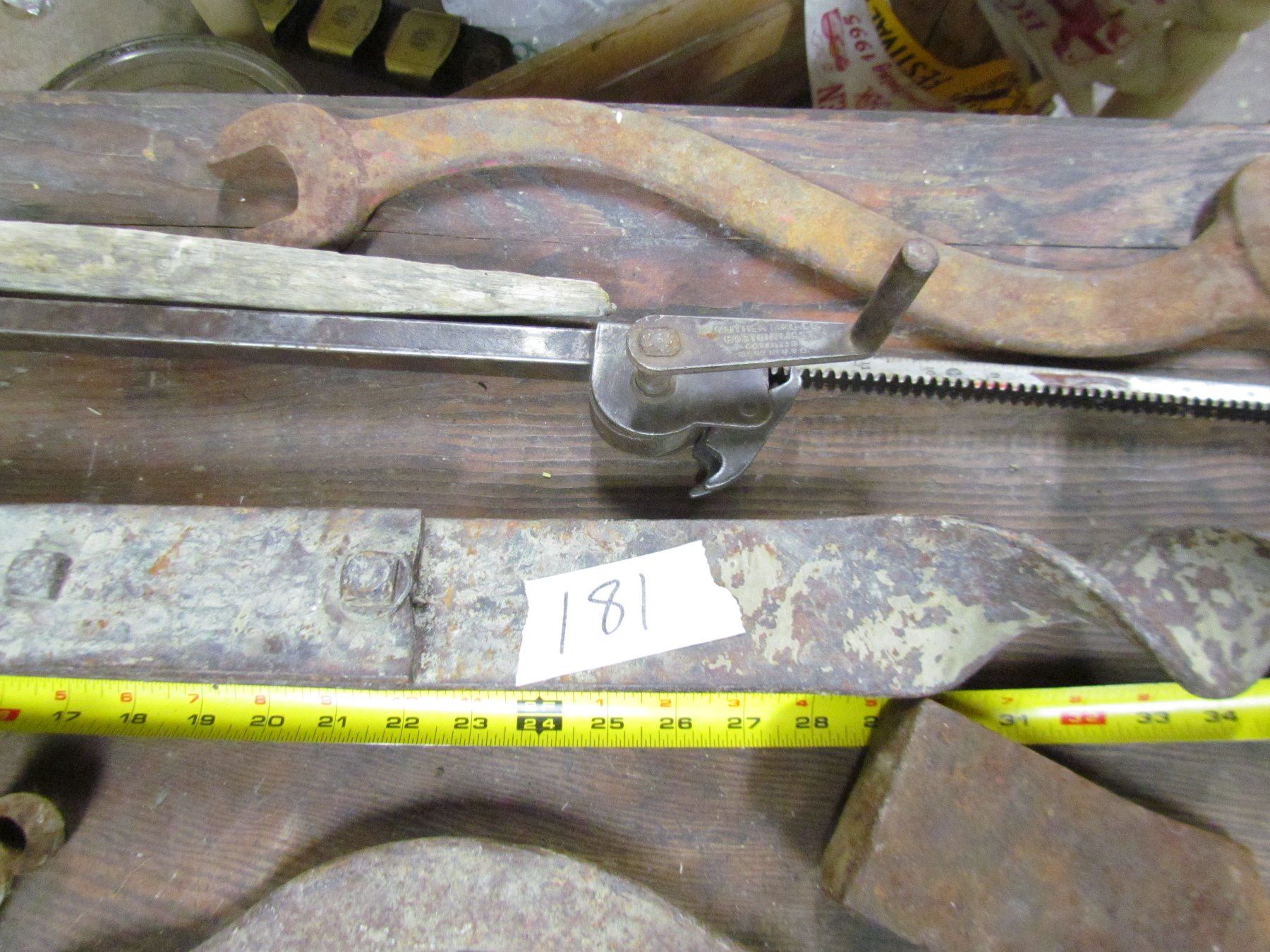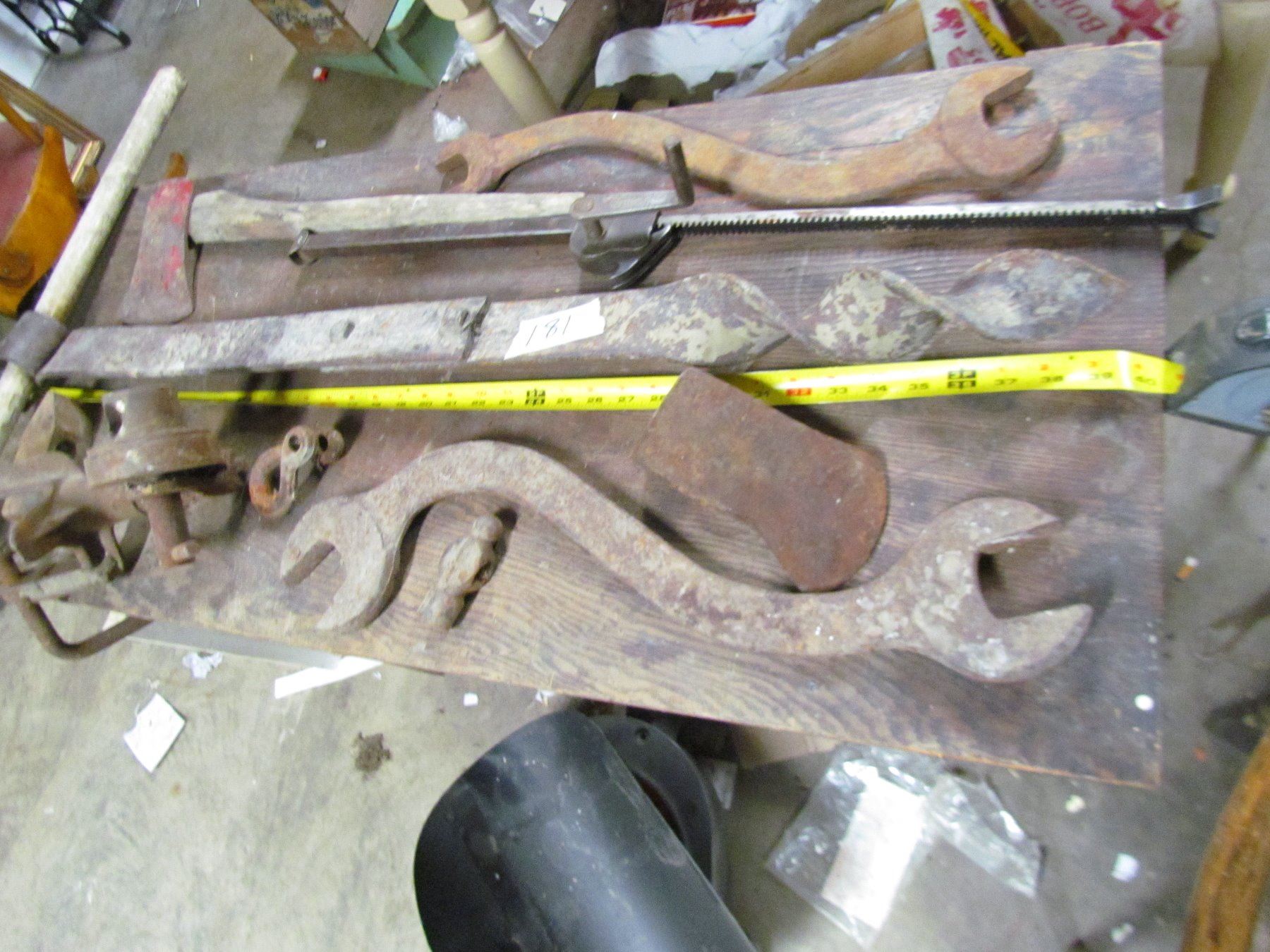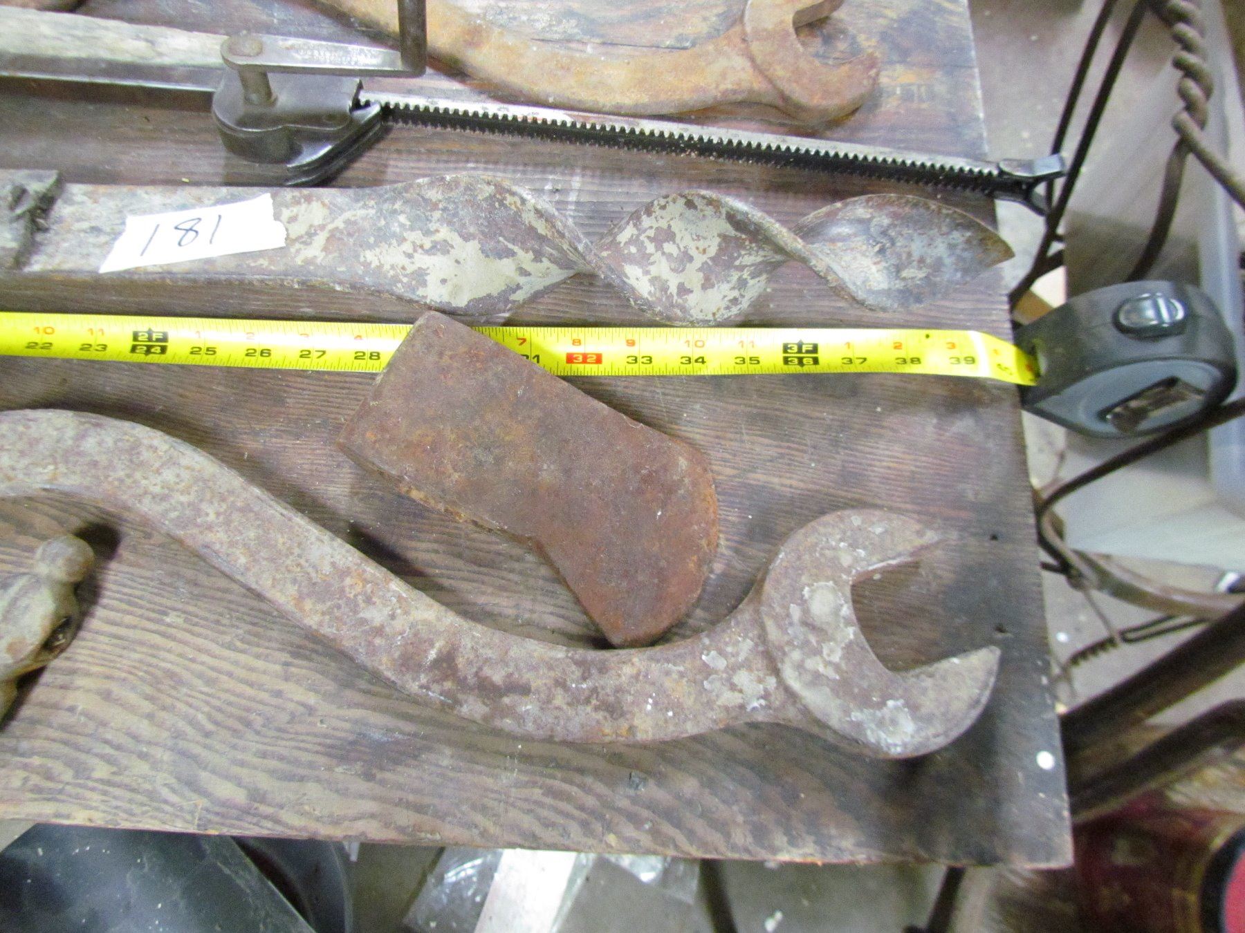 LOT OF 'VINTAGE' TOOLS (LARGE AUGER BIT, 36" WRENCHES, AX HEADS, ETC)