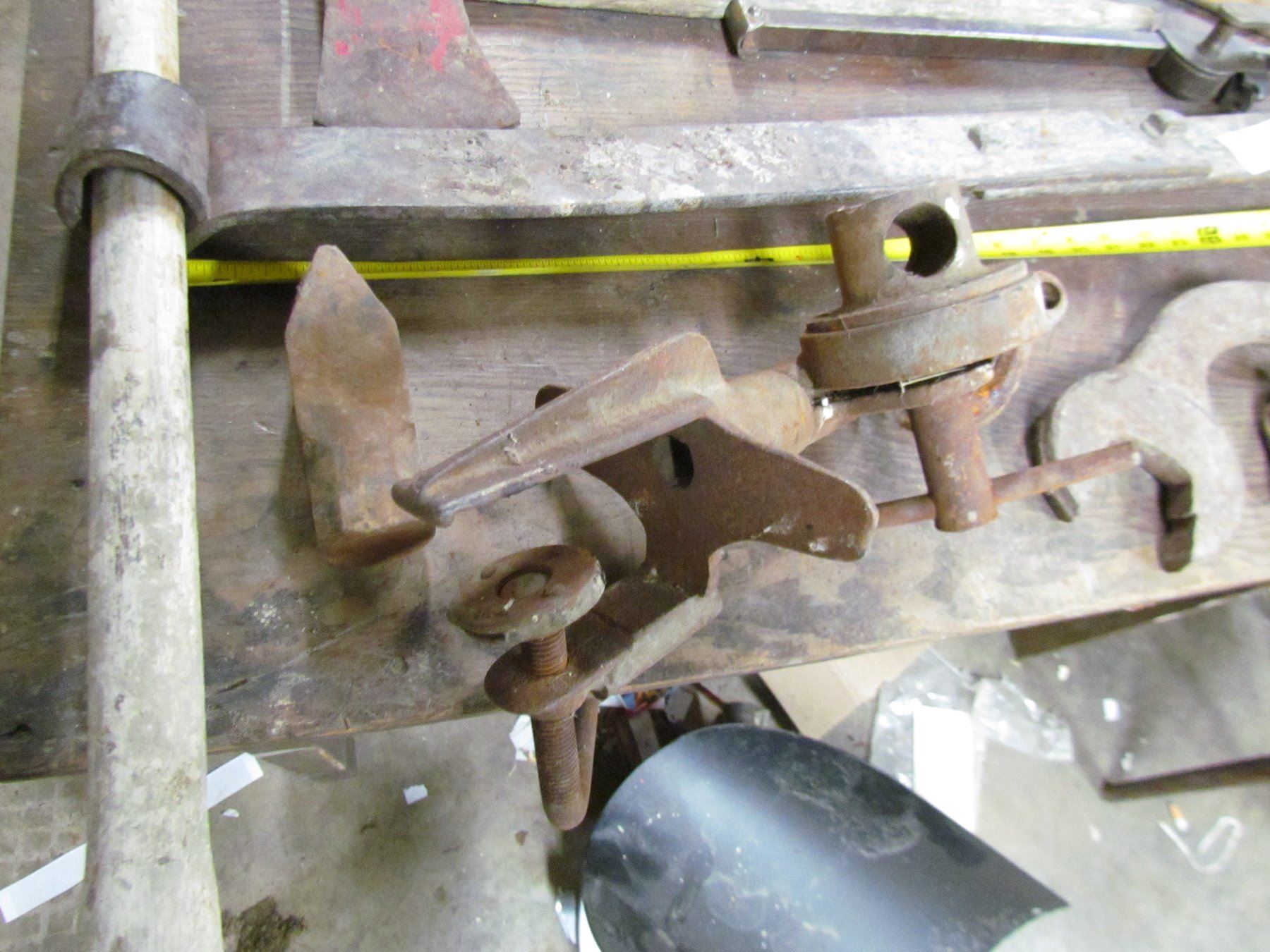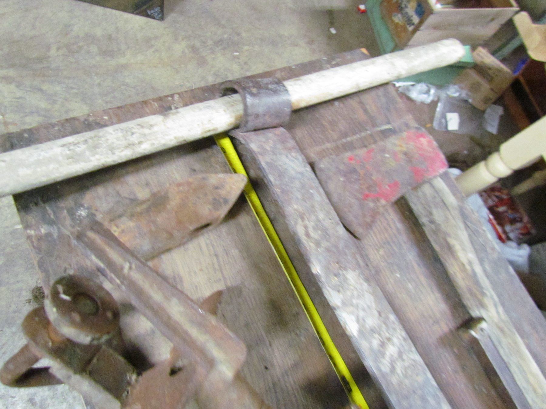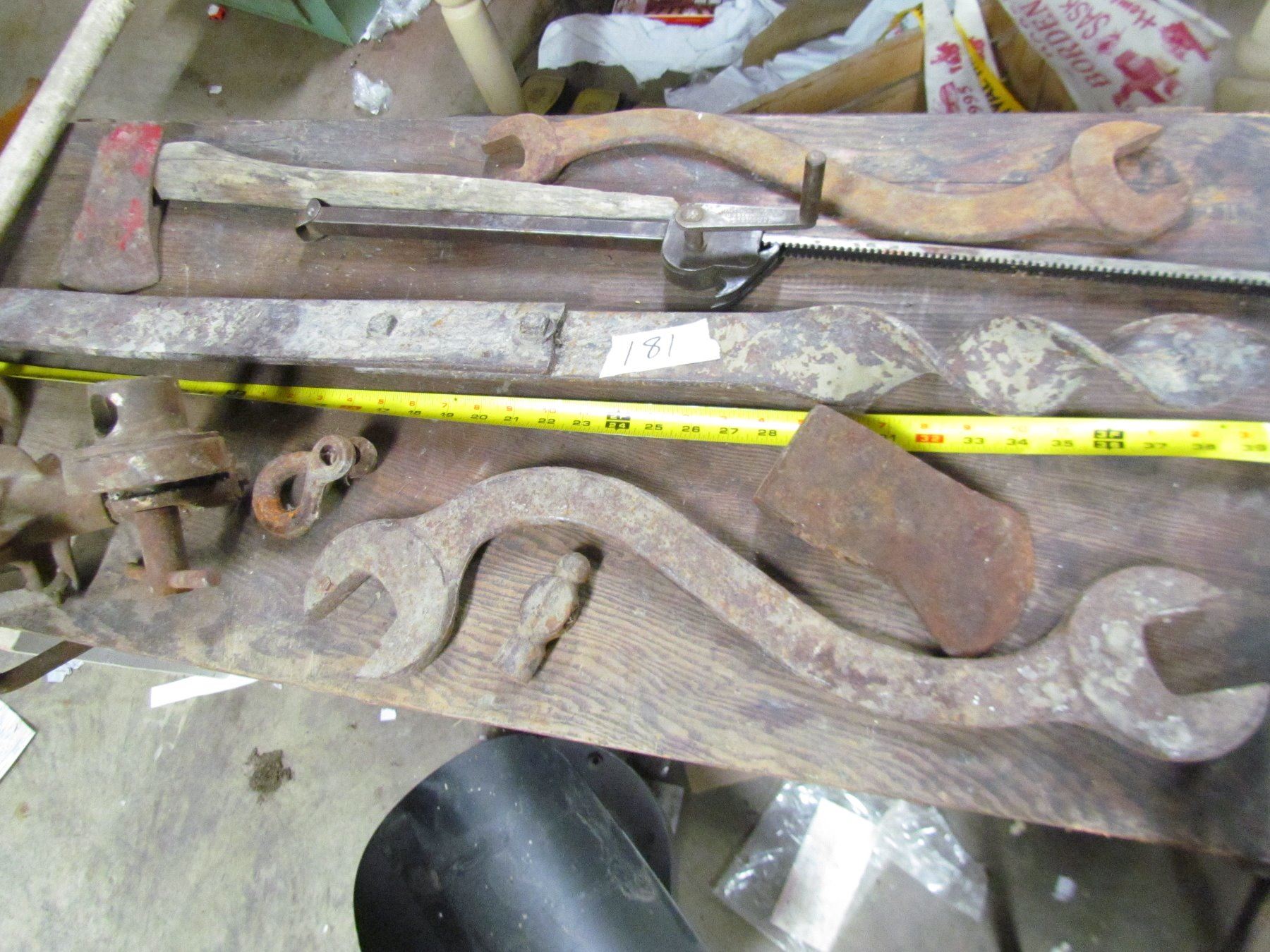 LOT OF 'VINTAGE' TOOLS (LARGE AUGER BIT, 36" WRENCHES, AX HEADS, ETC)