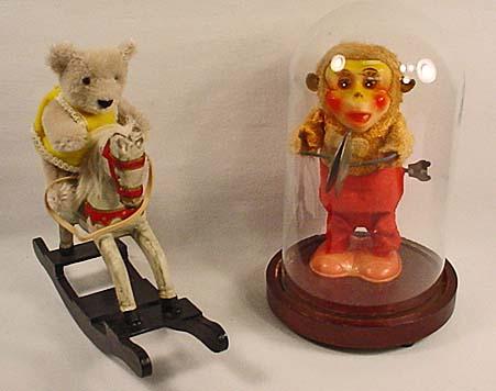 LOT OF VINTAGE TOYS - Monkey Playing Cymbals in Glass Dome and Mohair Teddy Bear with Wooden Rocking Horse