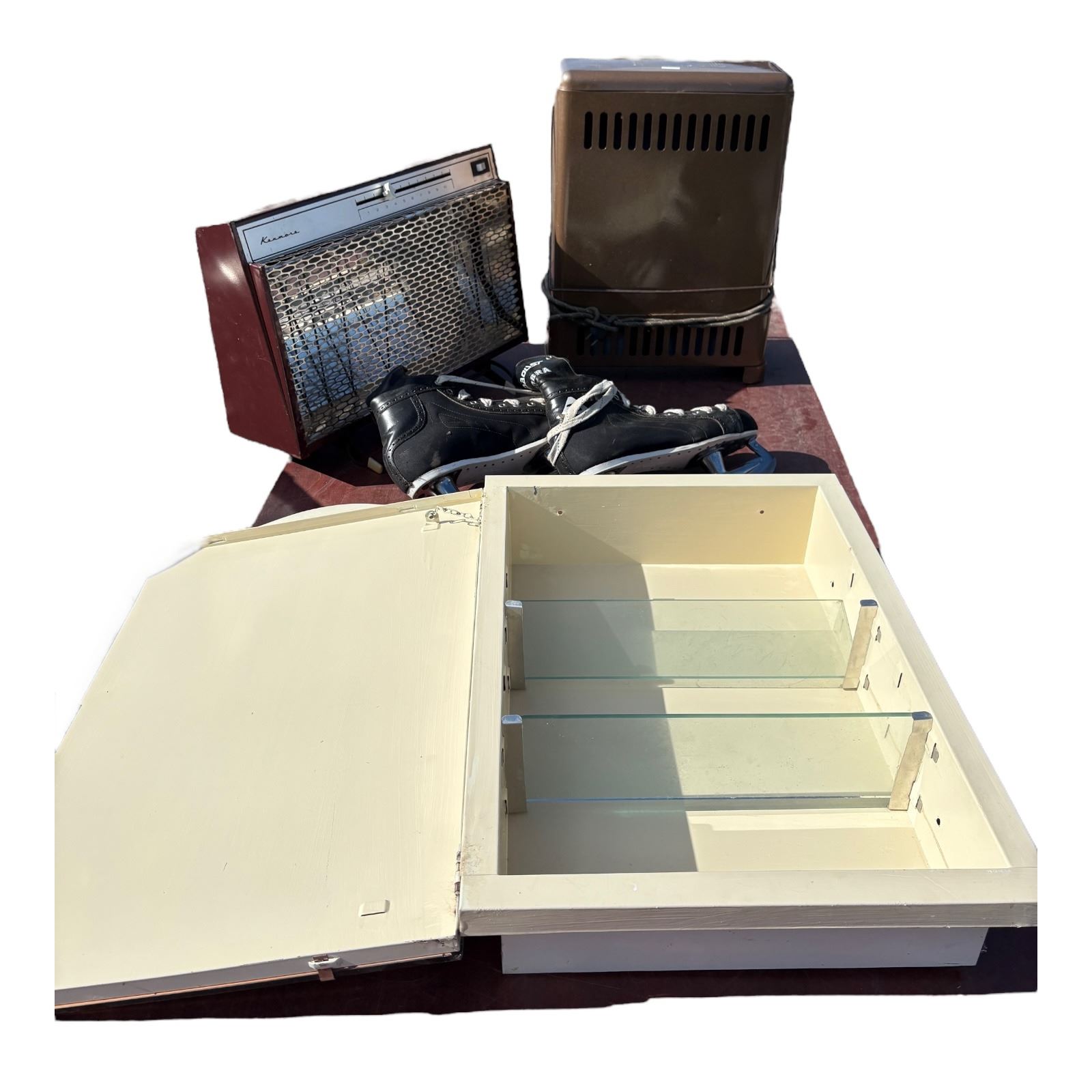 2 vintage electric heaters, size 11 older hockey skates, vintage medicine wall cabinet - NO SHIPPING / PICKUP ONLY