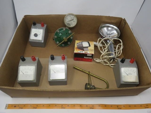 LOT OF VOLT METERS, GAUGES AND A FLASHLIGHT