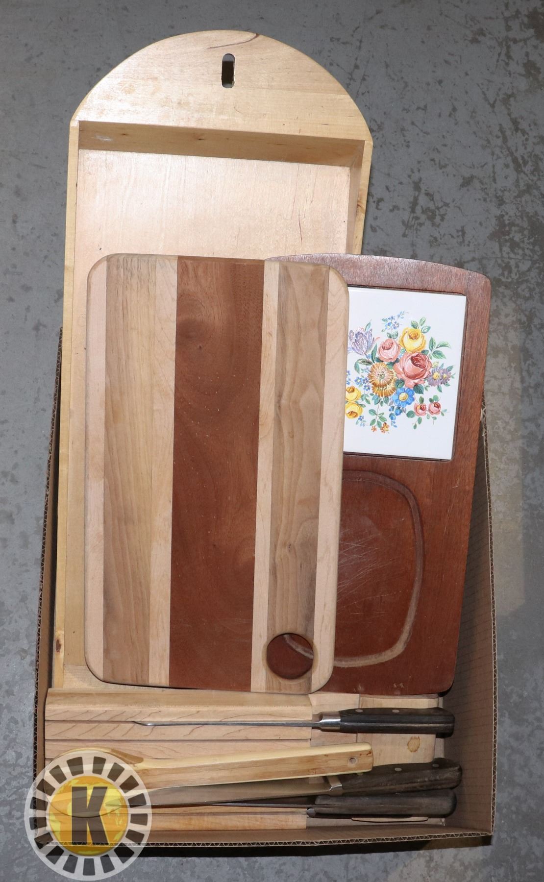 CUTTING BOARD SERVING TRAY KNIVES AND KNIFE HOLDER CUTTING BOARD HAS CERAMIC SQUARE FOR HOT POTS***ITEM(S) LOCATED IN LETHBRIDGE ALBERTA. SMALL ITEMS ONLY ARE AVAILABLE FOR FREE TRANSPORT TO EDMONTON OFFICE (READ AUCTION DETAILS FOR MORE INFORMATION)