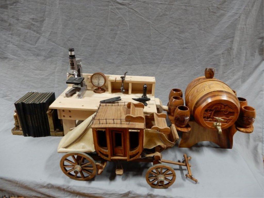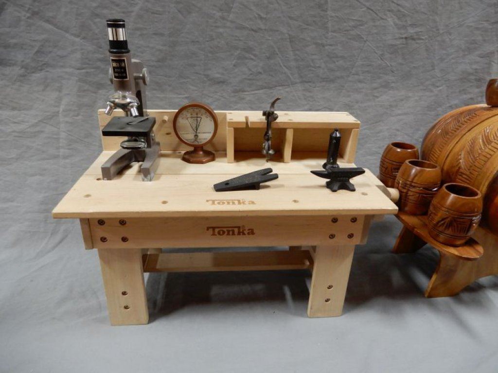 TONKA WORK BENCH WITH ACCESSORIES - STAGE COACH - KEG & CUPS - BOOKs & BOOKENDS