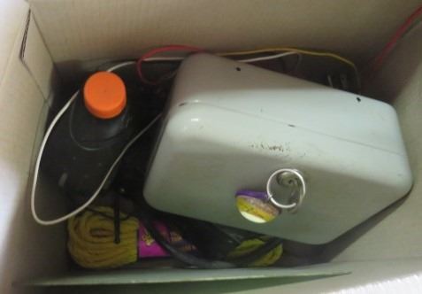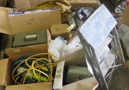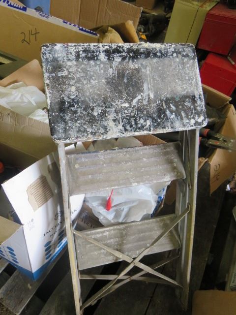 LOT OF YARD ITEMS (STEP LADDER, HEDGE TRIMMER, CANVAS TARP, EXTENSION CORDS, CHRISTMAS LIGHTS, ETC)