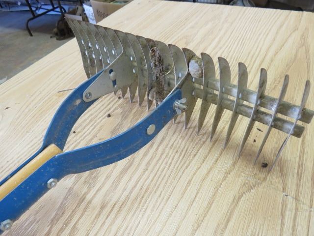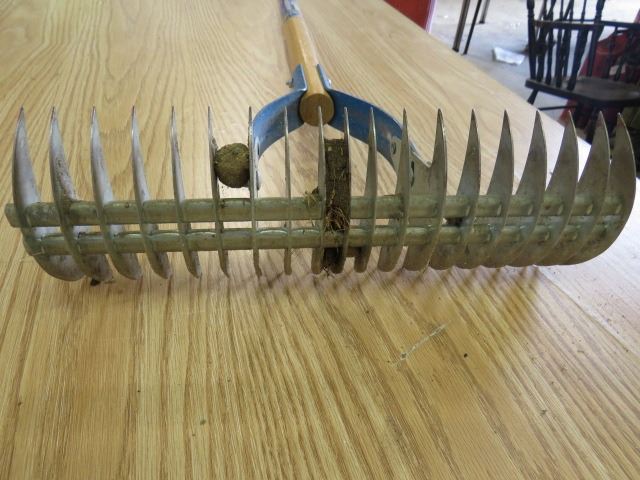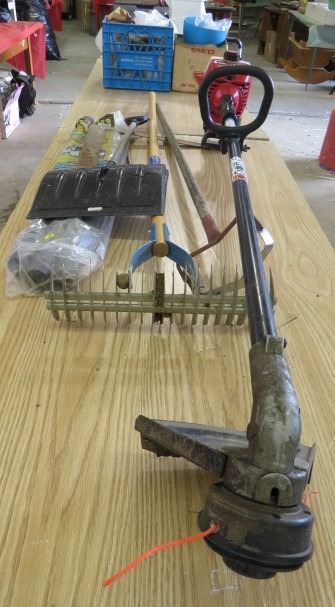 LOT OF YARD WORK ITEMS (PRO-GRADE RAKE, SELF SEALING PIPE, WEED WHIPPER, TOOLS, ETC)