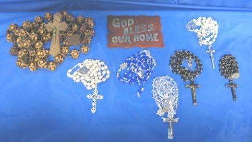 LOT, ROSARY COLLECTION (7) INCLUDING SIGN "GOD BLESS OUR HOME"