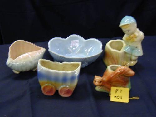 LOT SHAWNEE PLANTERS, 5 PCS. INCLUDES #154 SHELL,SHELL,COVERED WAGON, SQUIRREL, BOY, EXCELLENT
