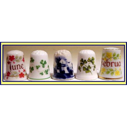 Lot of miscellaneous thimbles. One for the month of February, one for June.<BR>2 beautiful clover leaf thimbles and one lovely Delft thimble from Holland.