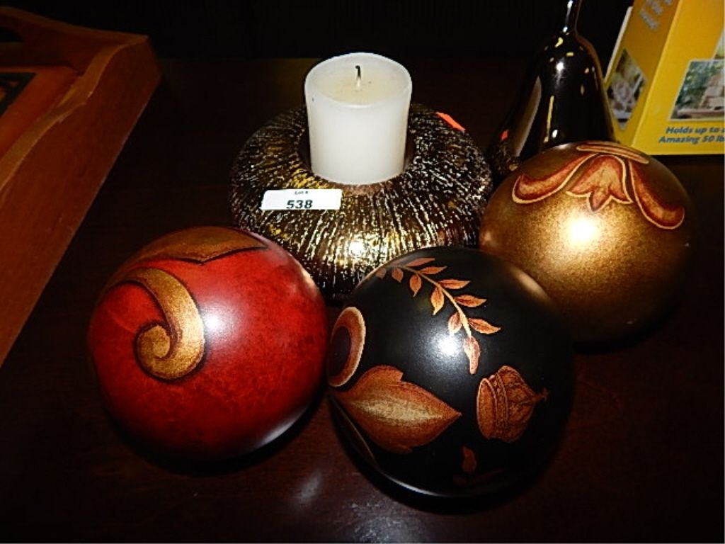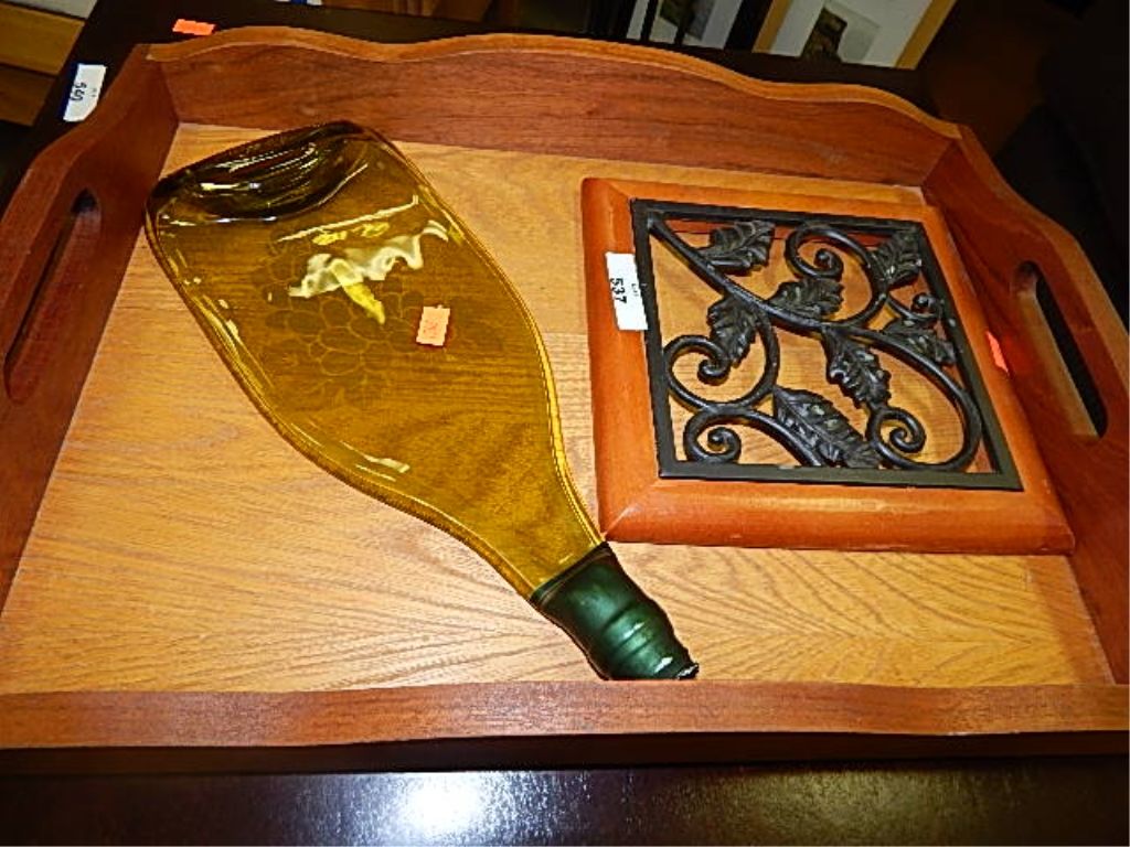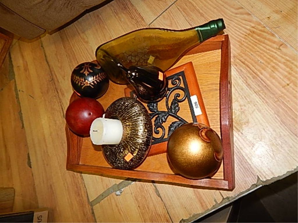 LOT - TRAY, TRIVET, FLATTENED GLASS BOTTLE, CANDLE HOLD, PEAR AND 3 ACCENT BALLS