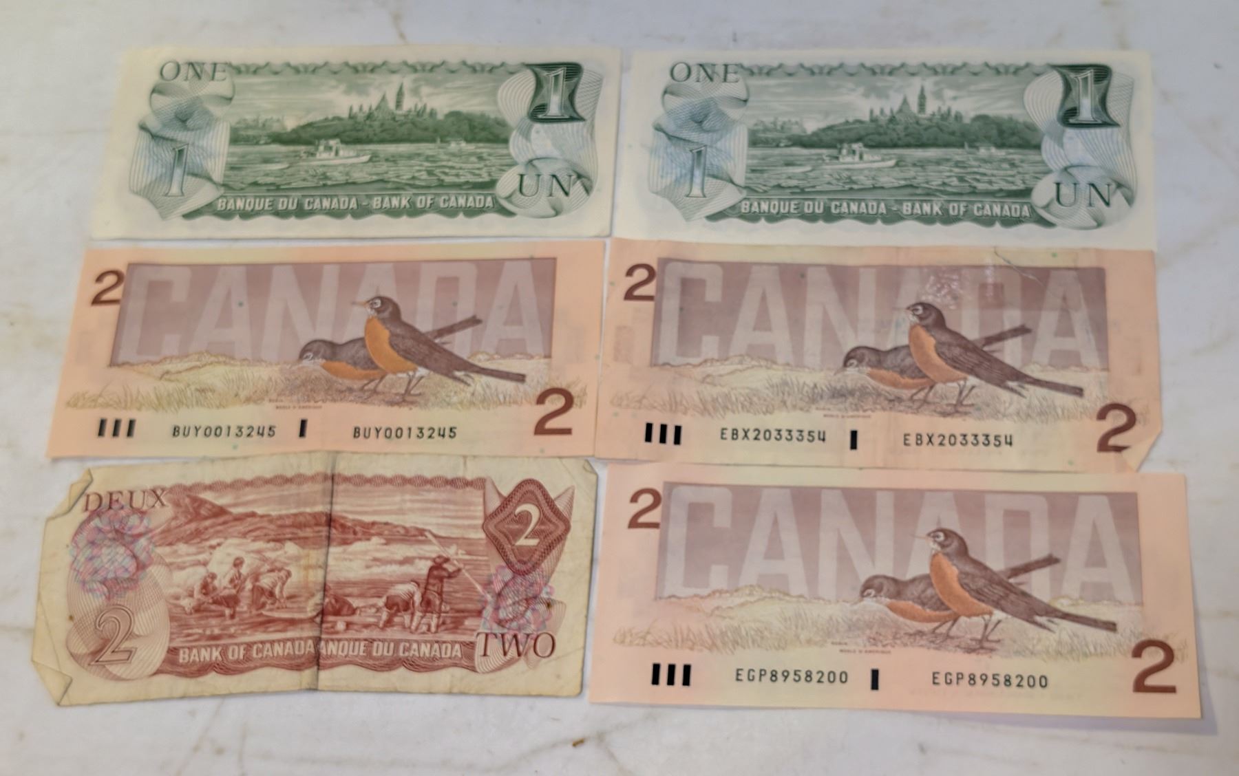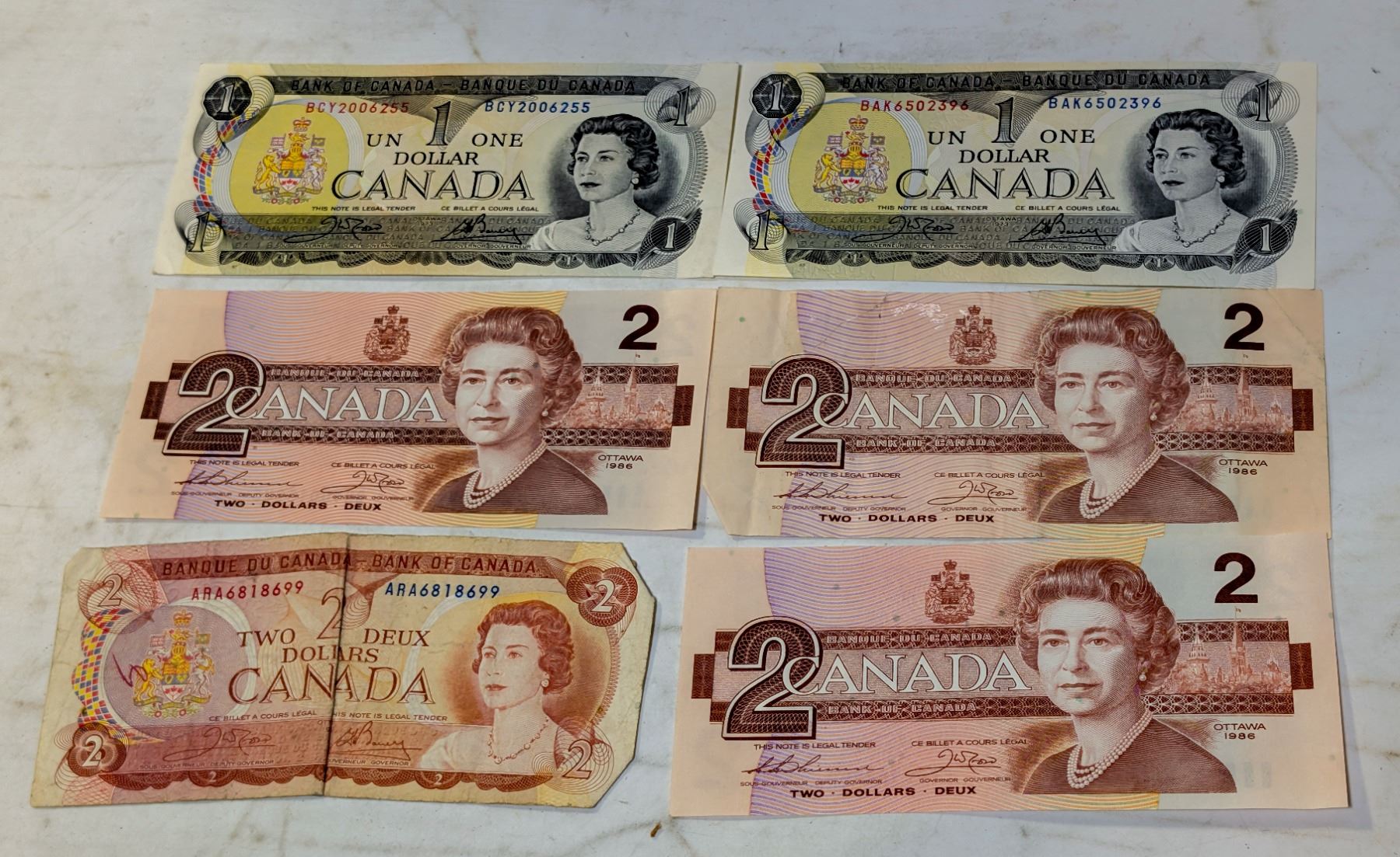 LOT VINTAGE CANADA 1 & 2 DOLLAR BILLS