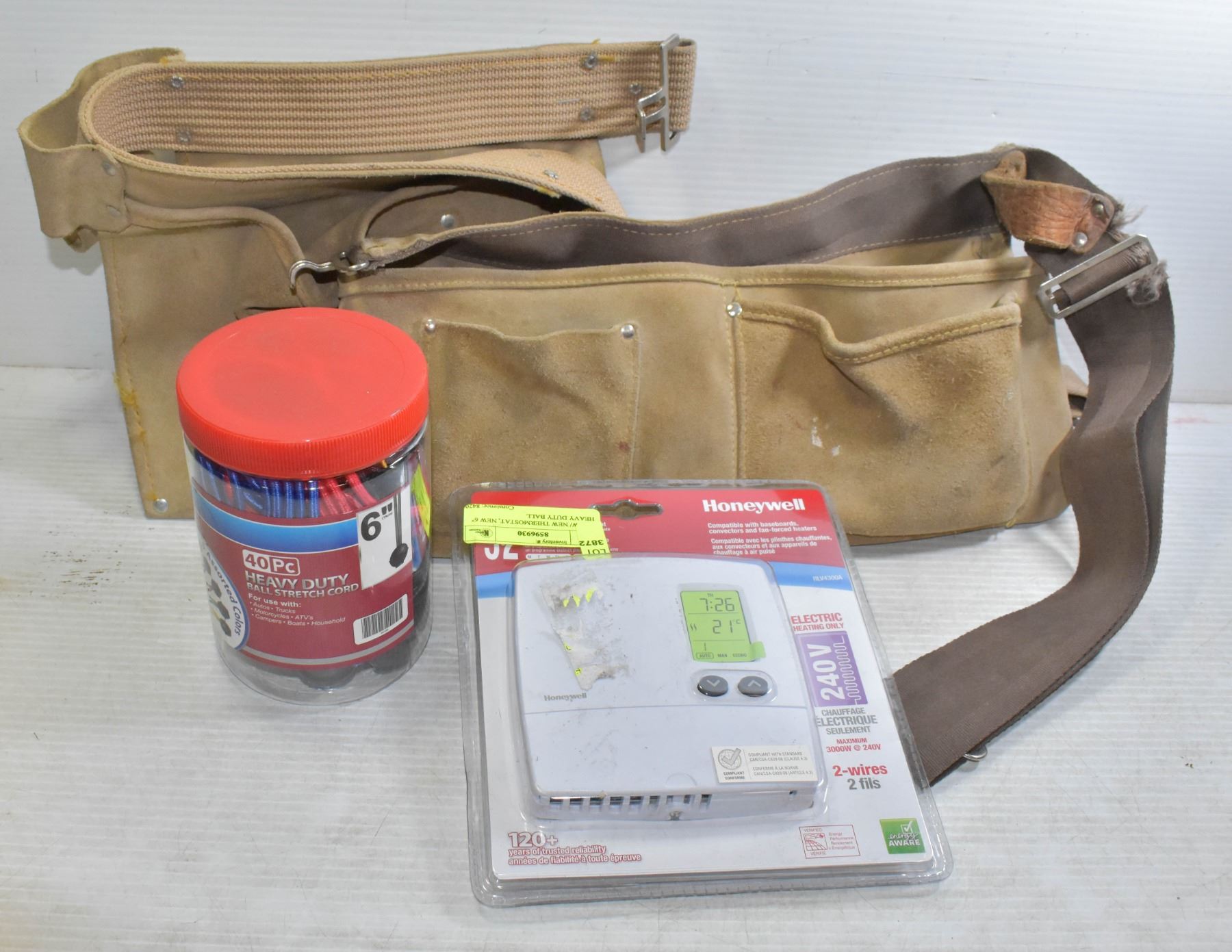 LOT W/ NEW THERMOSTAT, TOOLBELTS AND STRETCH CORDS