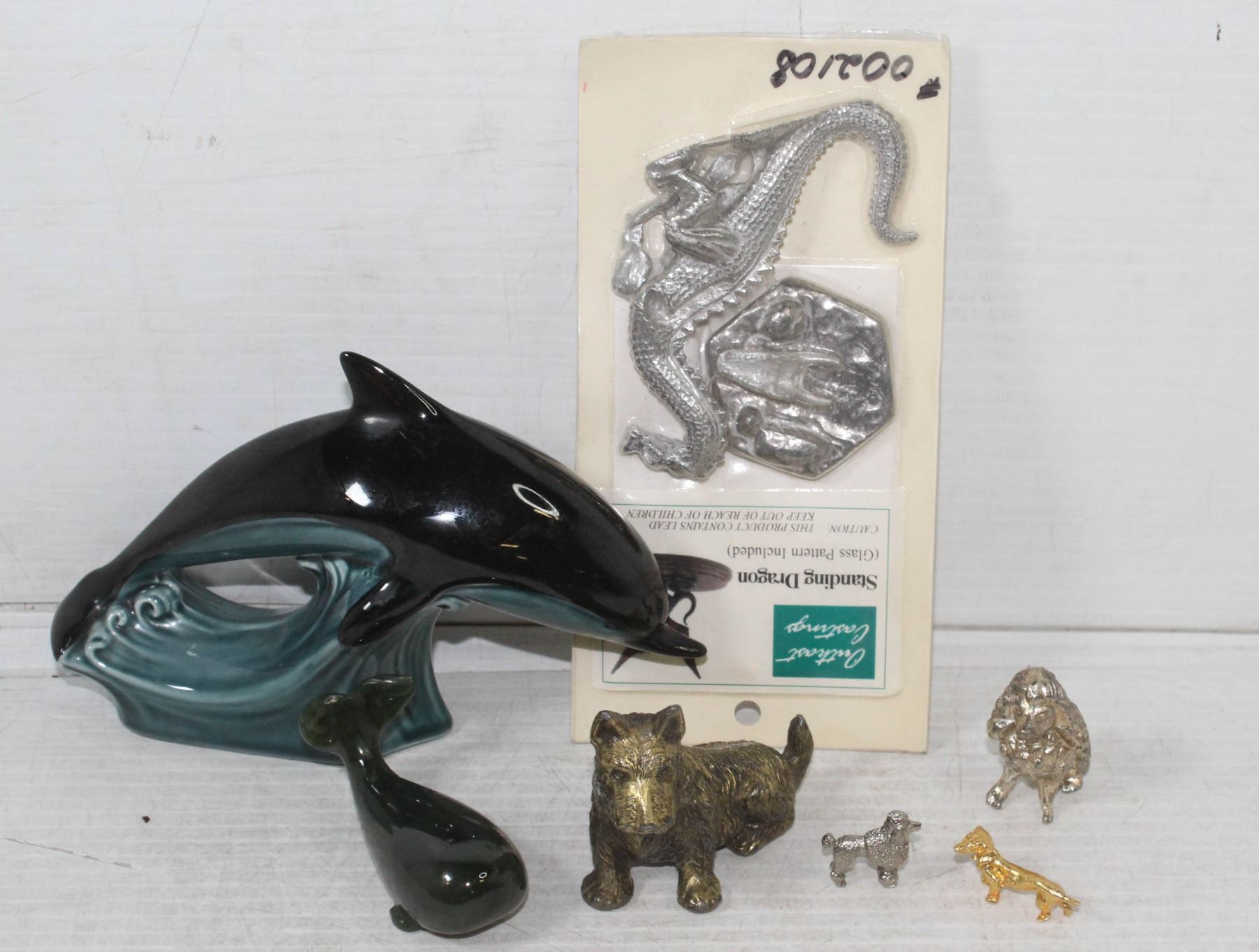W/SOAP STONE WALE MINATURE, POOL ENGLAND WHALE & SEALED LEAD DRAGON WITH STAND