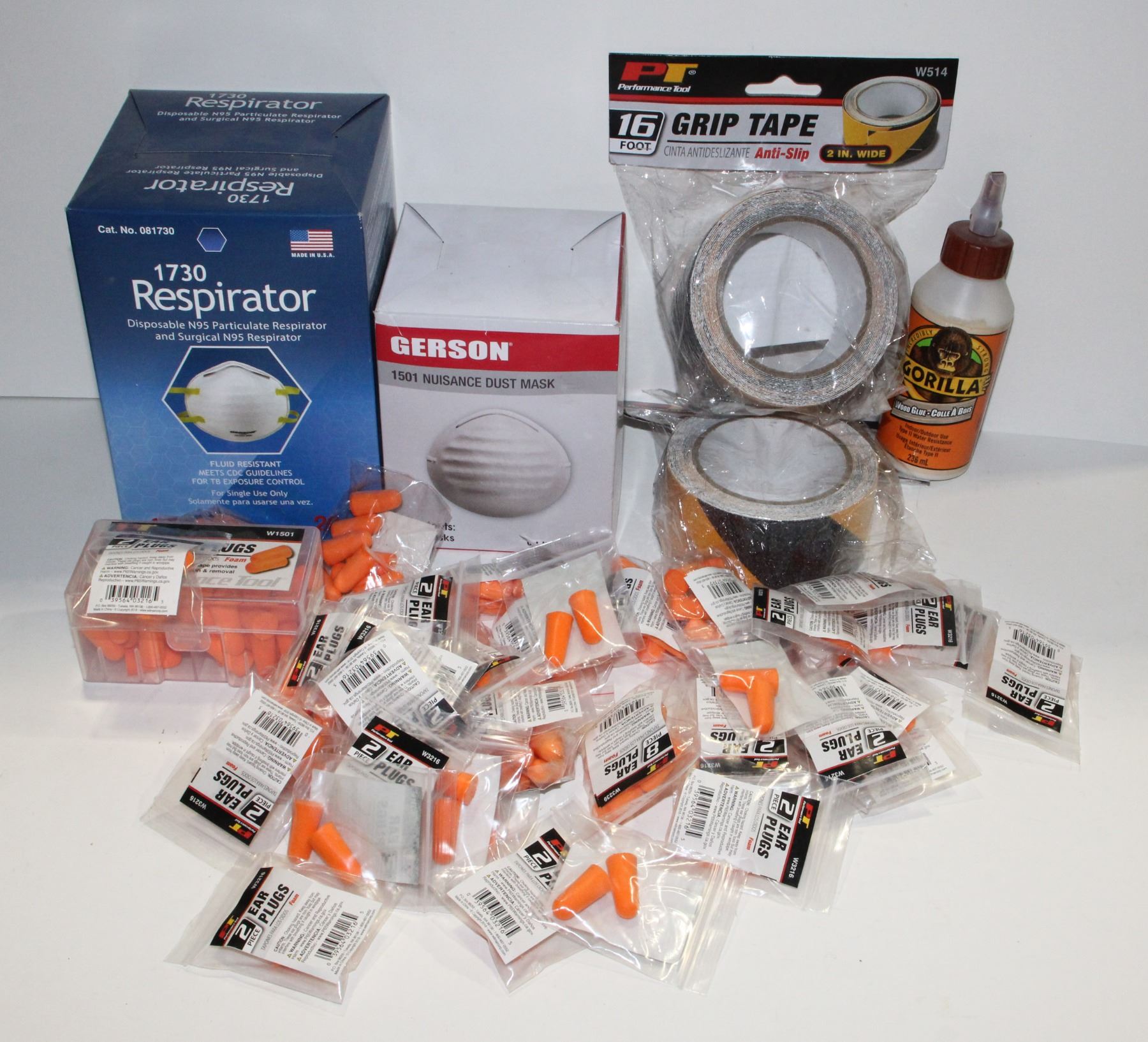 LOT WITH EAR PROTECTION, DUST MASKS, GRIP TAPE,