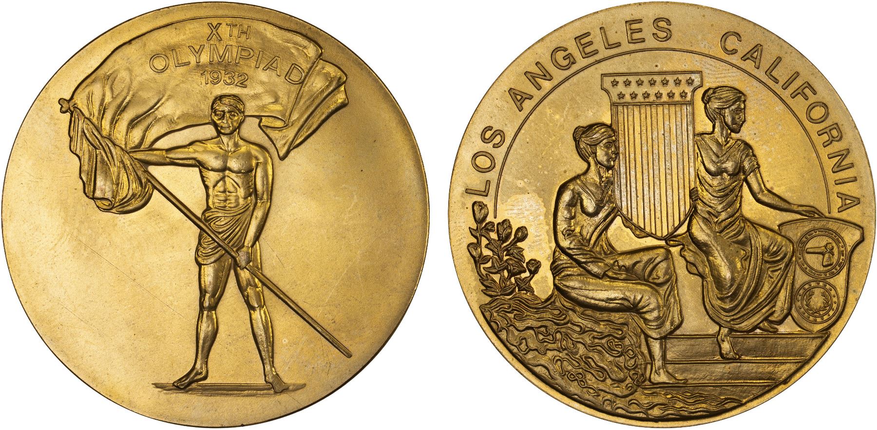 UNITED STATES: AE medal, 1932, 69mm gilt bronze participant's medal from the 1932 Los Angeles Olympics by Julio Kilenyi for Whitehead-Hoag; athlete standing facing with unfurled banner with inscription Xth / OLYMPIAD / 1932 // two female figures seated holding heraldic shield between them, with shield with seals of the State of California and the City of Los Angeles at right and a California Poppy plant at left, WHITEHEAD-HOAG on edge, PCGS graded Brilliant Unc.