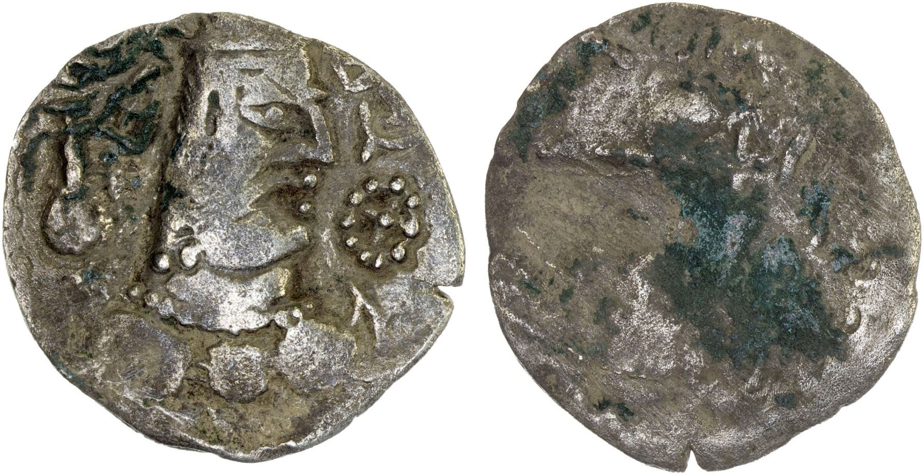 ALCHON HUNS: Toramana, ca. 490-515, AR drachm (3.01g), G-115, crowned bust right, solar symbol before, filleted trident behind // almost completely blank reverse as almost always, VF, RR.