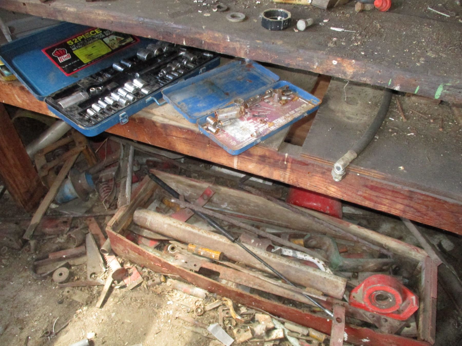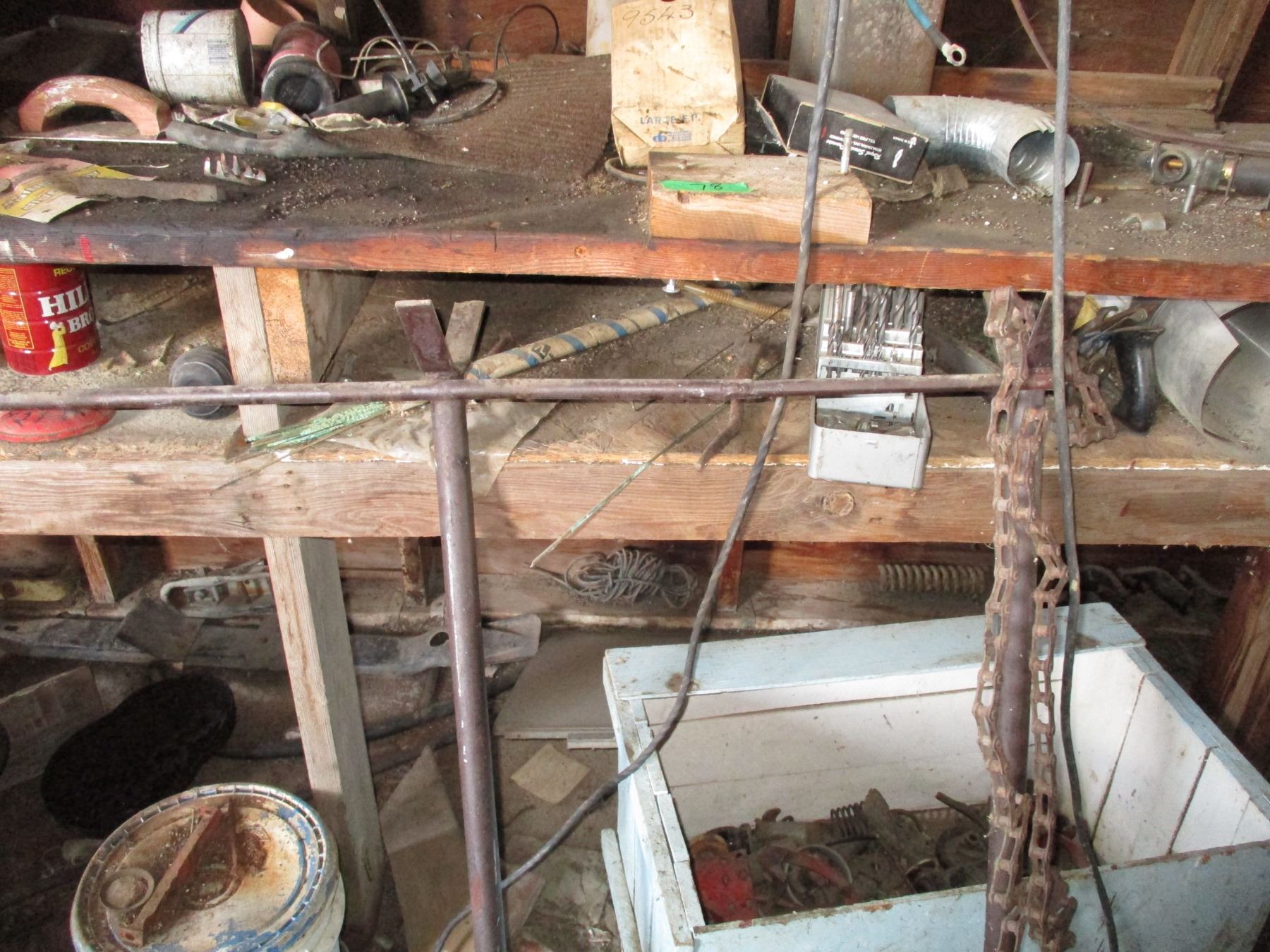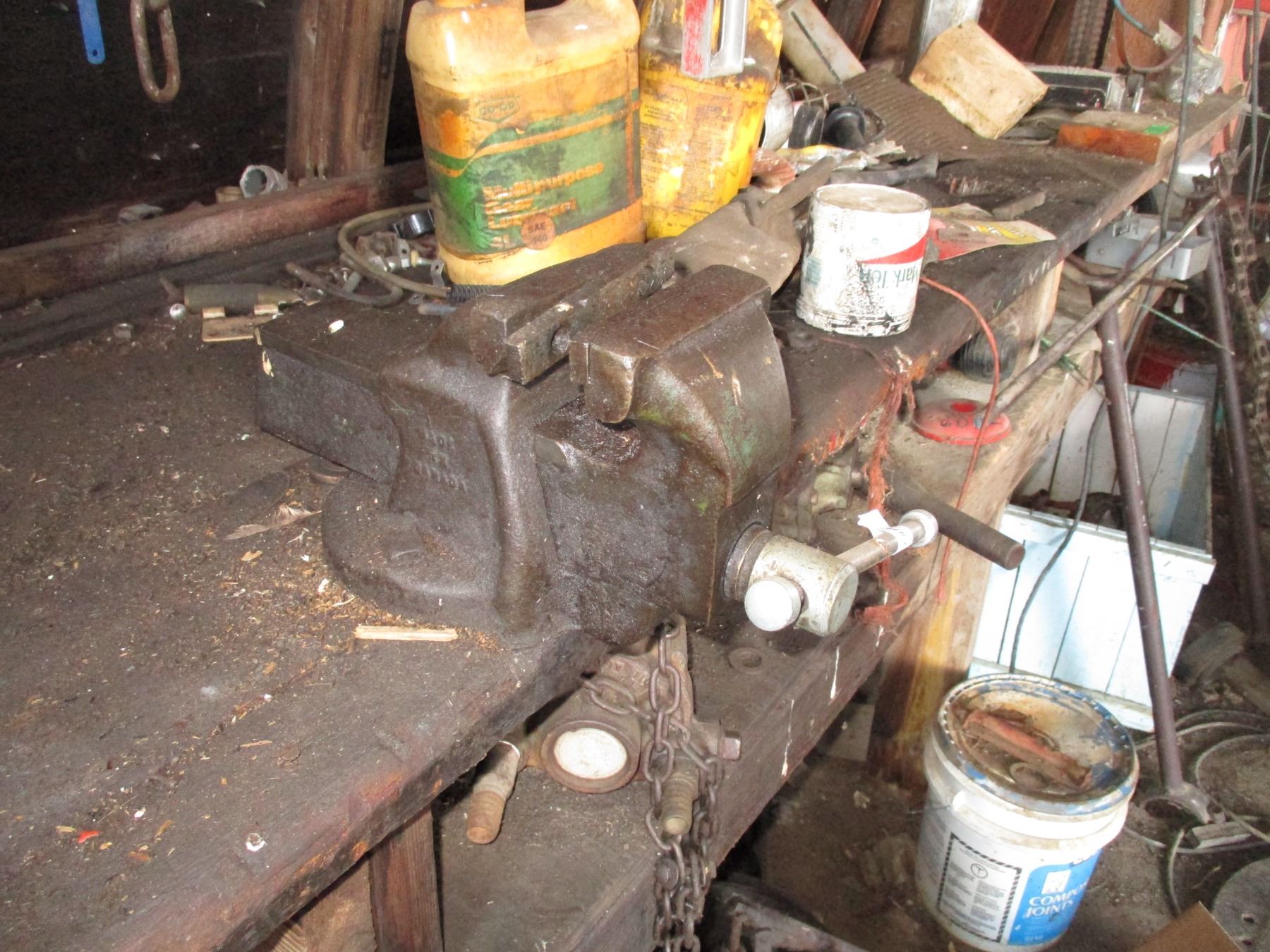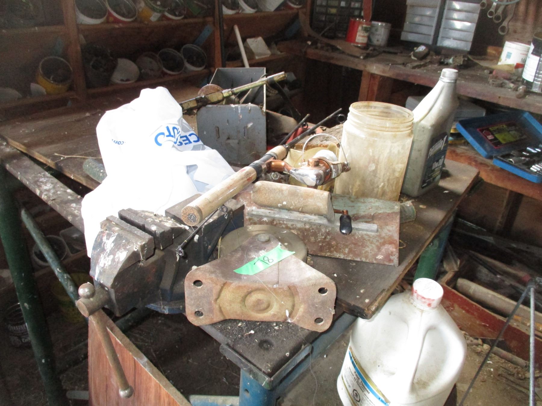 LOT - Work bench with wall contents - metal stand + (2) vises, wrenches, bolt bin, scrap iron, etc (large lot!)