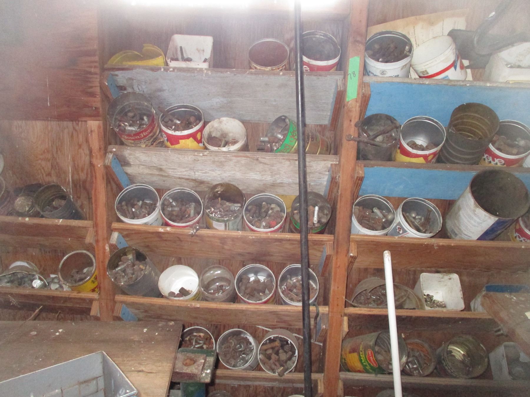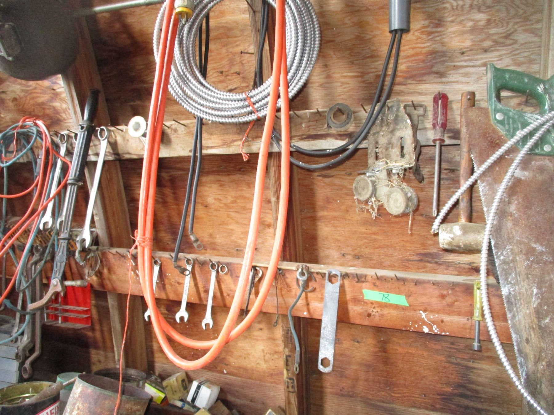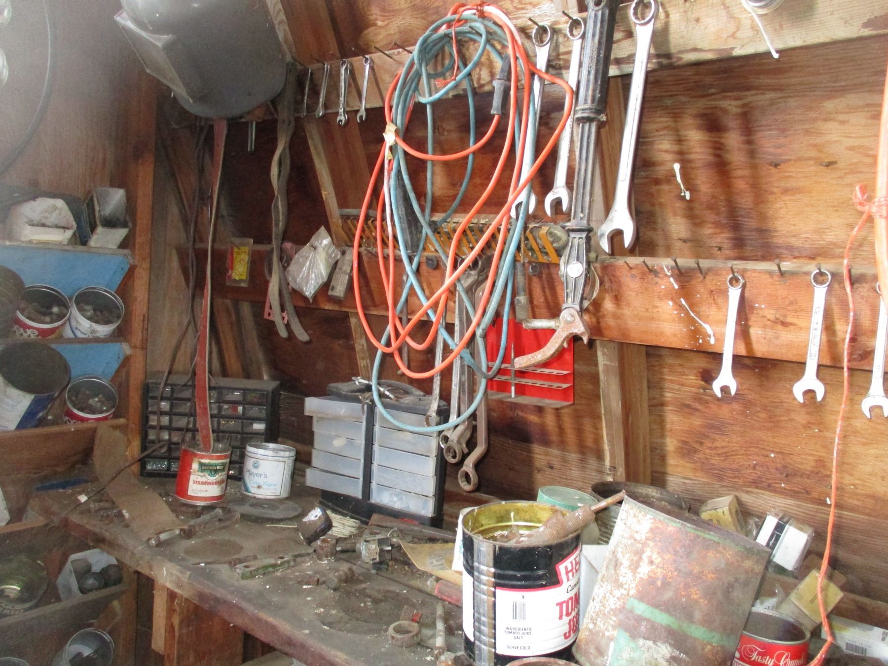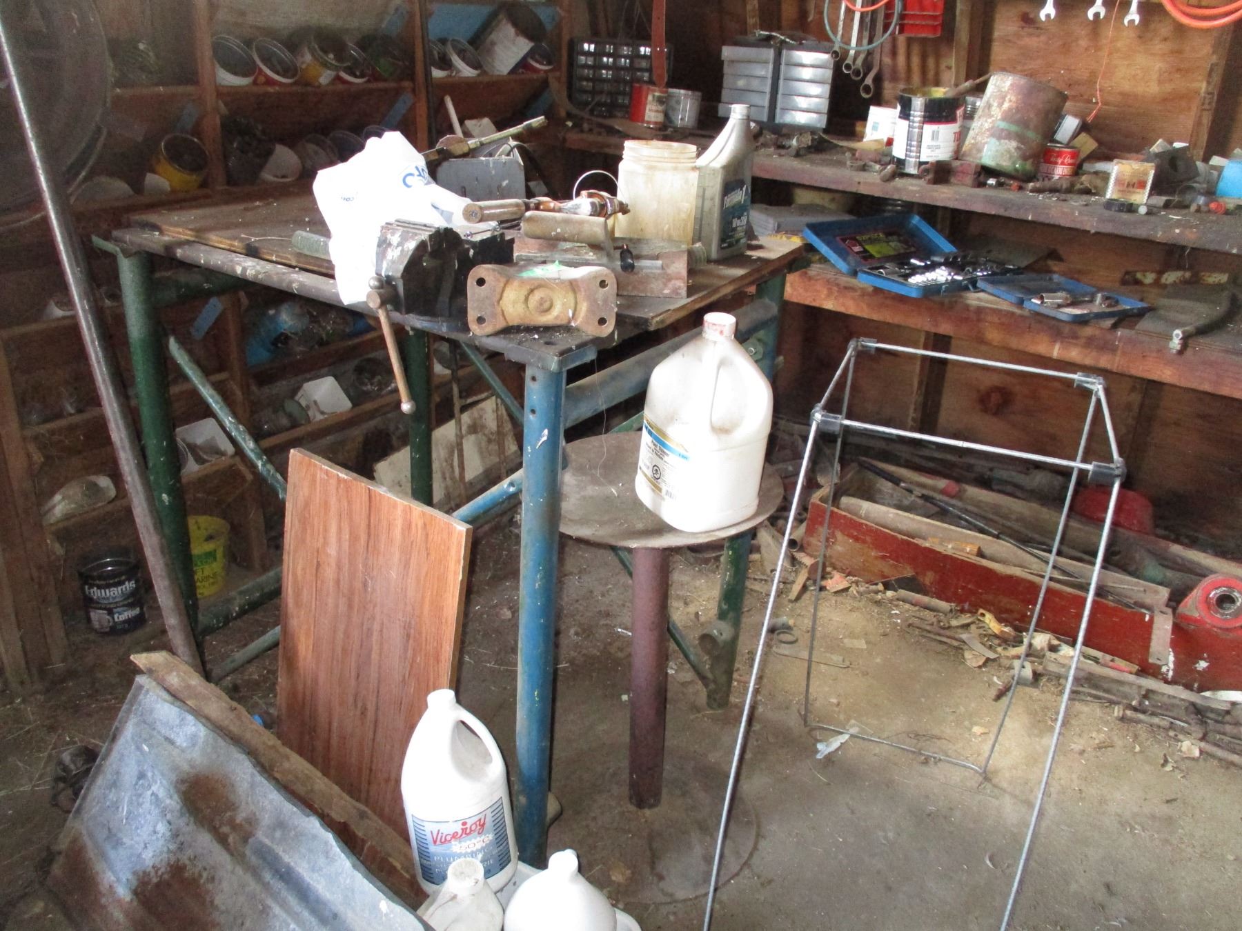 LOT - Work bench with wall contents - metal stand + (2) vises, wrenches, bolt bin, scrap iron, etc (large lot!)